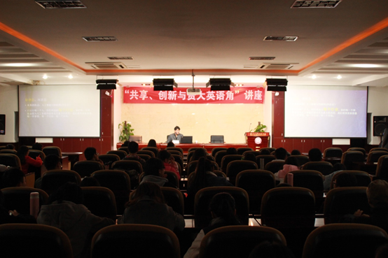 2016年12月1日晚上7:00,由美国南卡大学计算机博士生导师、贵州大学机械学院访问教授即贵州大学英语角的倡导者——胡建军老师主讲的“共享、创新与贵大英语角”讲座于乐动官方网站三楼报告厅举行。