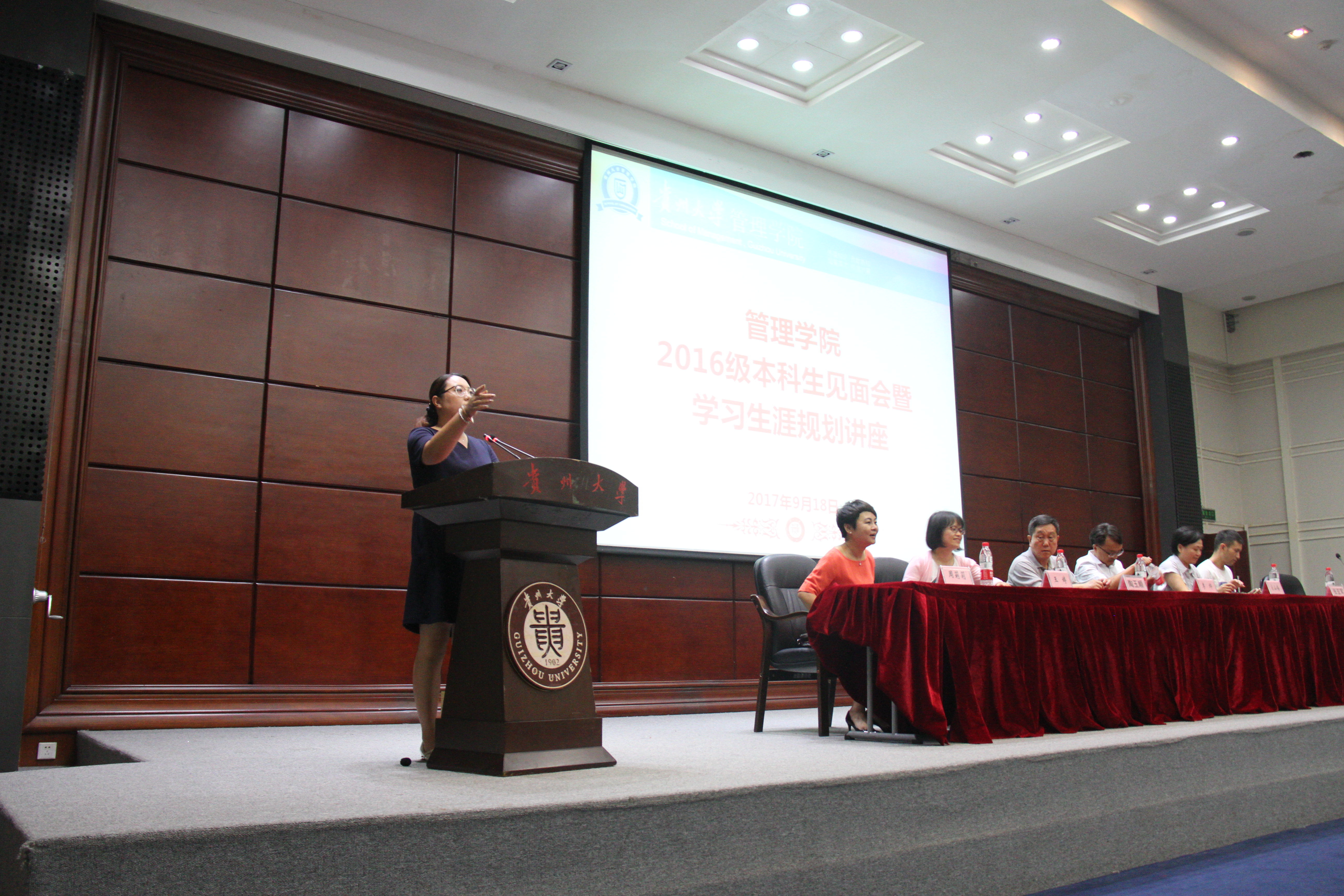 9月18日晚19:00,管理学院2016级本科生见面会暨学习生涯规划讲座在一号行政楼报告厅举行。学院党委书记陶玉顺,院长李烨,副院长王婷、宋山梅、周莉莉,党委副书记张亚军,学院各职能部门负责人,本科生学业导师及辅导员参加会议,会议由学生科科长芮丽华老师主持。