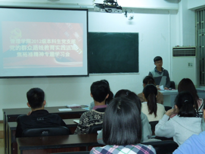 2014年4月25日晚七点,管理学院2012级本科生党支部党的群众路线教育实践活焦裕禄精神专题学习会在管理学院二楼214教室召开。会议由支部书记王珂老师主持,支部正式党员和预备党员共计30人参加了会议(2人请假)。