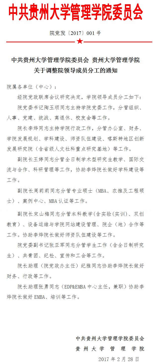 中共乐动官方网站委员会 乐动官方网站关于调整院领导成员分工的通知