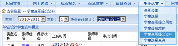 可进行学年、学期、毕业设计题目切换。选择文件后,进行资料上传、提交,同时可以查看教师的审核情况。、