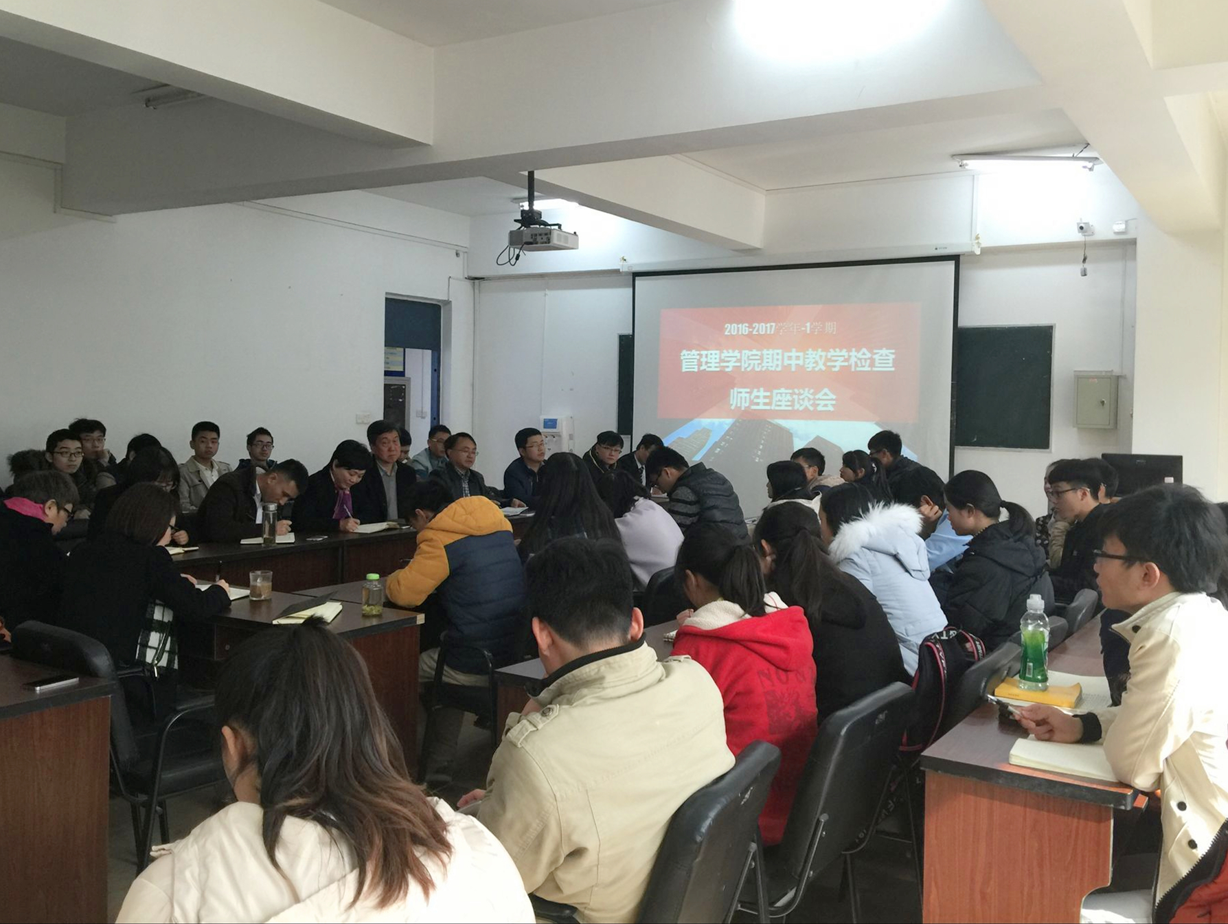 根据学校教务处关于2016-2017学年第一学期期中教学检查要求,我院于12月5日中午1:00,在学院408教室召开期中教学检查师生座谈会。院党委书记陶玉顺,院长李烨,副院长宋山梅、王婷,院党委副书记张亚军,各教研室主任、支部书记,教学科、学生科工作人员,及13-15级各班学生代表共60余人参加座谈会。会议由分管教学副院长宋山梅主持。