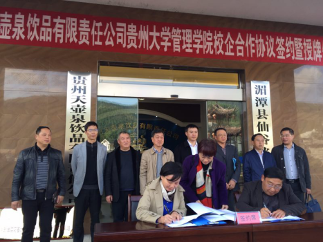 11月10日,我院与贵州天壶泉饮品有限公司在遵义市湄潭县举行校企合作框架协议签约仪式暨乐动官方网站本科生研究生实习基地挂牌仪式。乐动官方网站书记陶玉顺、副院长宋山梅、李桥兴教授、办公室主任纪雅、李会萍副教授、王云副教授、旅游与文化产业学院书记刘剑、罗阳教授等出席活动。