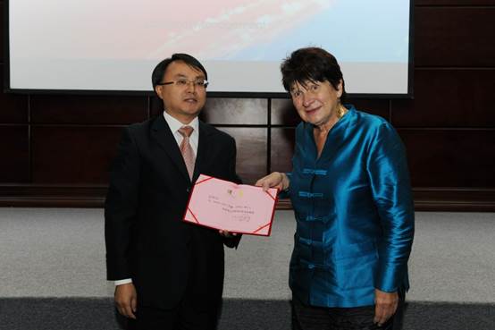 图3:聘任仪式,乐动官方网站院长李烨教授为丹娜.左哈尔教授(Danah Zohar,英国)颁发聘书