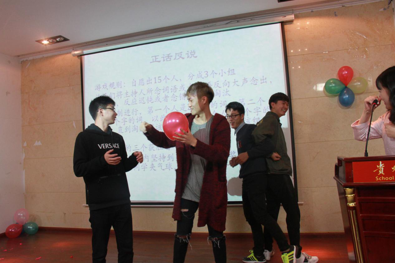 在第三个游戏开始之前,主持人鼓动大家又参与了一次线上抽奖活动,奖品均由现场工作人员进行发放。最后一个游戏为个人组队游戏,现场观众毛遂自荐,游戏名为:正话反说,活动内容如下:现场毛遂15个人,分成3个小组,选手们将主持人所念词语或者短语反向大声念出,限时5s,反应迟钝或者念错者直接淘汰,该游戏以淘汰制进行,第一个人是2个字的词,第二个人是3个字的词,以此类推,第五个人是6个字的短语,直到淘汰到该组只剩下一个人即为该组获胜者。最后剩下的三个获胜者可获得奖品,而剩余同学夹气球,每两人夹破一个气球。该游戏只有一位同学坚持到了最后,其余的同学均接受了惩罚。