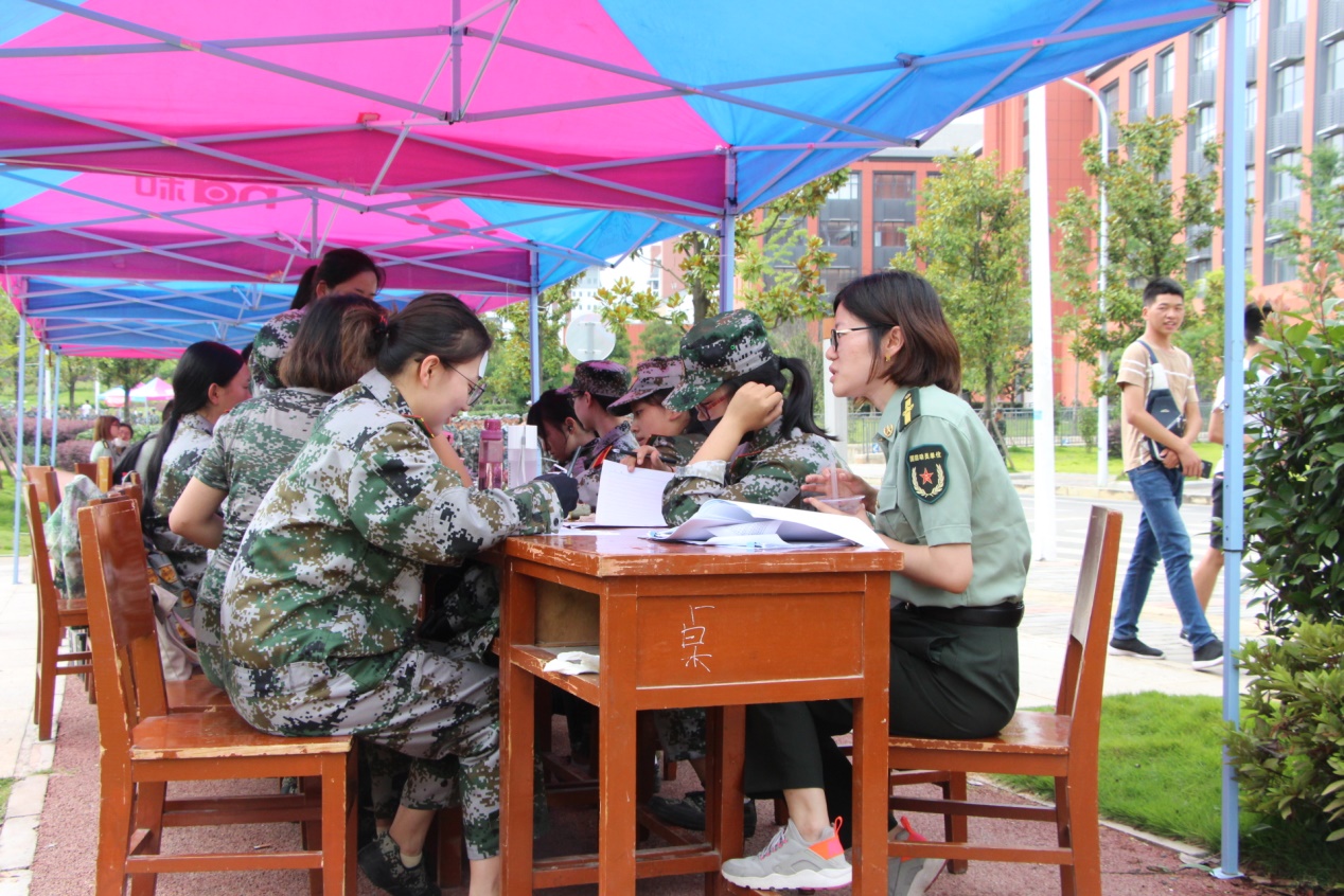 在军训场地摆点值班的同学不仅仅为学弟学妹们提供凉爽的矿泉水,还跟着车老师一起走访场地,与同学们亲切交流,对军训期间的问题进行收集,并且尽全力去解决在走访中发现的问题。