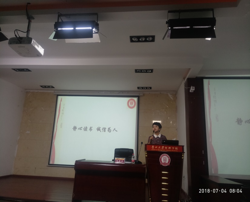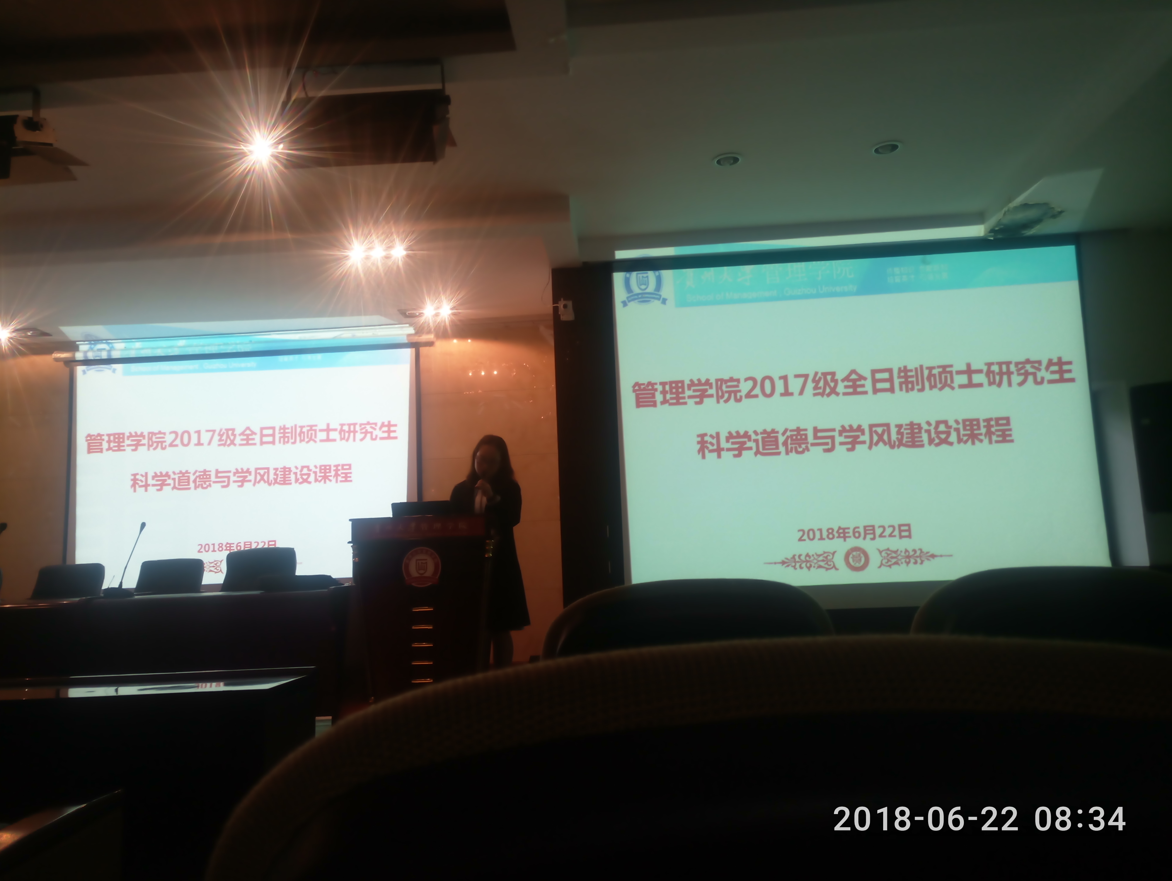 201874日上午8:00在管理学院三楼报告厅,管理学院2017级全日制研究生(学术型、专业型)开展学习科学道德与学风建设第二次课程。此课程由管理学院研究生辅导员邵美婷老师主持,管理学院副院长周莉莉教授主讲。周教授以“静心读书 诚信为人”为主题开展此次课程。
