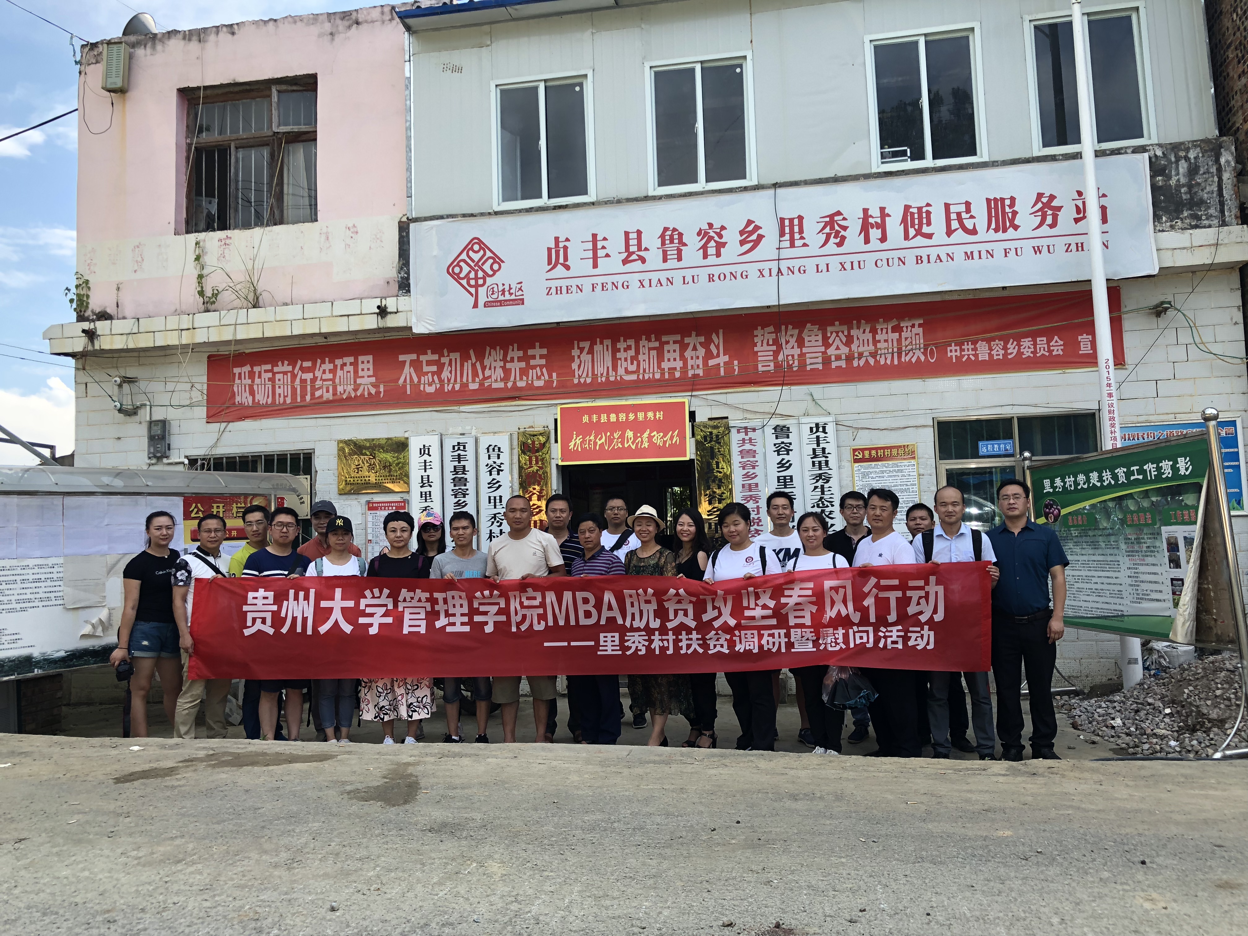 为深入贯彻党的十九大精神,落实《贵州大学脱贫攻坚“春风行动”实施方案》和《贵州大学对口帮扶贞丰县精准扶贫行动实施方案》要求,按照以“发挥教育优势、参与精准扶贫、促进脱贫致富”行动的宗旨,我院积极利用管理学科优势和工商管理人才优势,并积极整合贵州金戈戟科技发展有限公司,共同扎实推进精准扶贫行动,2018720日,我院MBA赴贞丰县鲁容乡开展扶贫调研暨慰问活动。