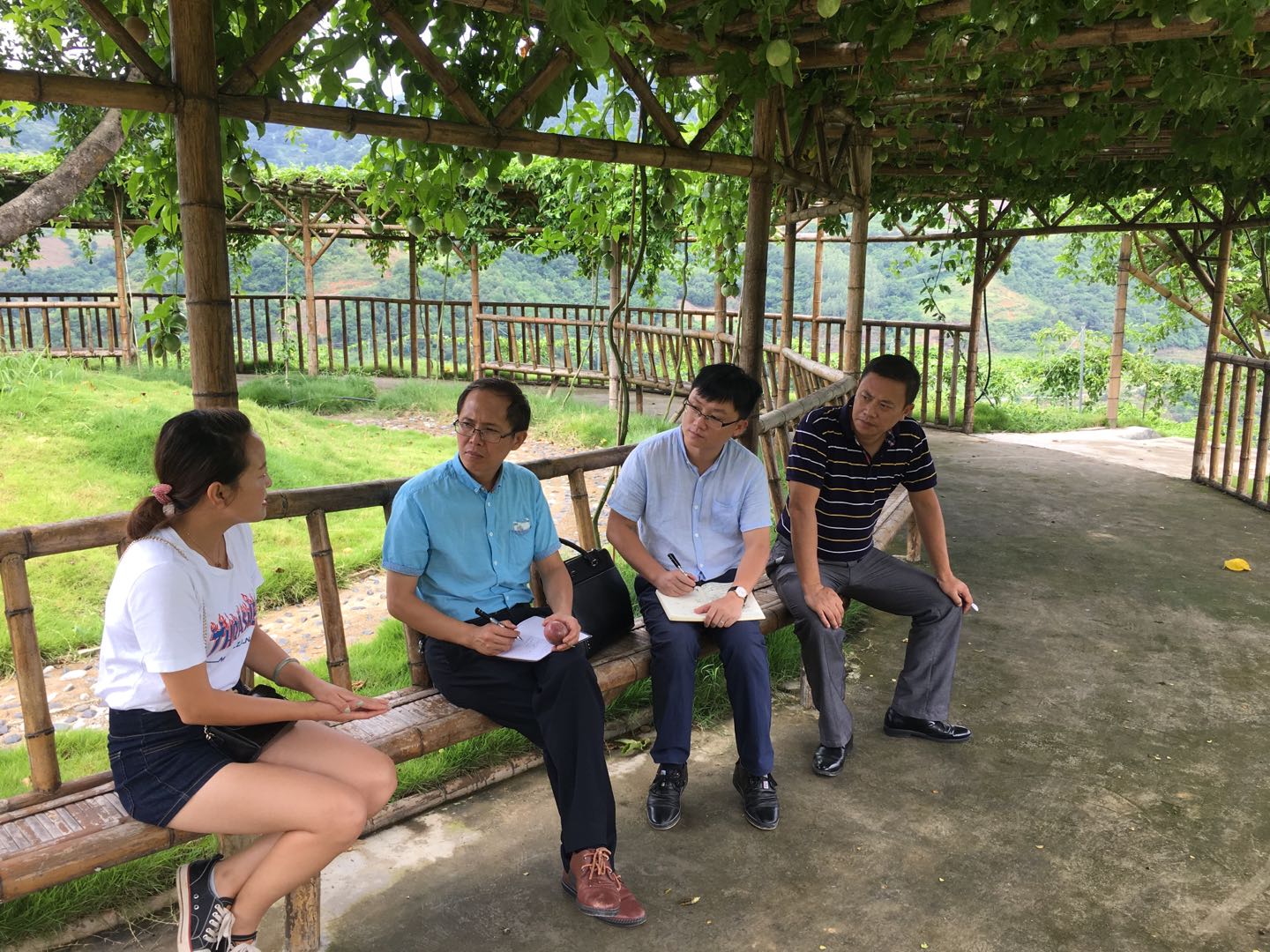 上午,王茂春教授与刘遗志博士在贵州大学公共管理学院党委副书记、鲁容乡前线工作队队员杨玻教授、鲁容乡惠农公司总经理龚雨雨、副总经理蔡世俊的陪同下考察了百香果基地,详细了解了百香果的总体规模、生长周期、销售情况、目标群体、竞争格局以及品牌建设等相关情况。