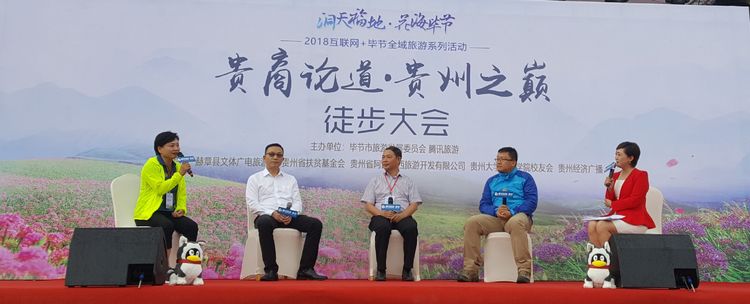 ↑“贵商论道·贵州之巅”徒步大会论道环节,由贵州知名主持人“大方姐”申炜主持,贵大管理学院副院长宋山梅,独立经济学者、知名战略咨询师龙河闻,毕节市旅发委副主任施正军,贵州卫视《论道》栏目执行总监吴睿迪轮流执筒,围绕毕节旅游如何发展,精彩论道……
