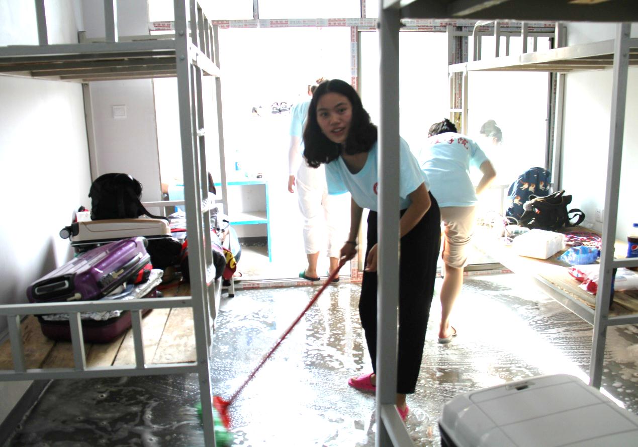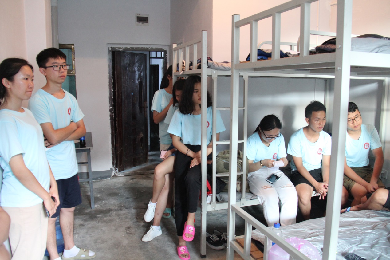 在服务队打扫完寝室卫生后,陈老师向我们细说了接下来几天的团队注意事项:1、让各个小组分工明确,认真做好本职工作;2、各个组长构建团队意识,让队员们团结努力,共同克服接下来几天的困难;3、青春大学习;每个小组采取年级穿插制,