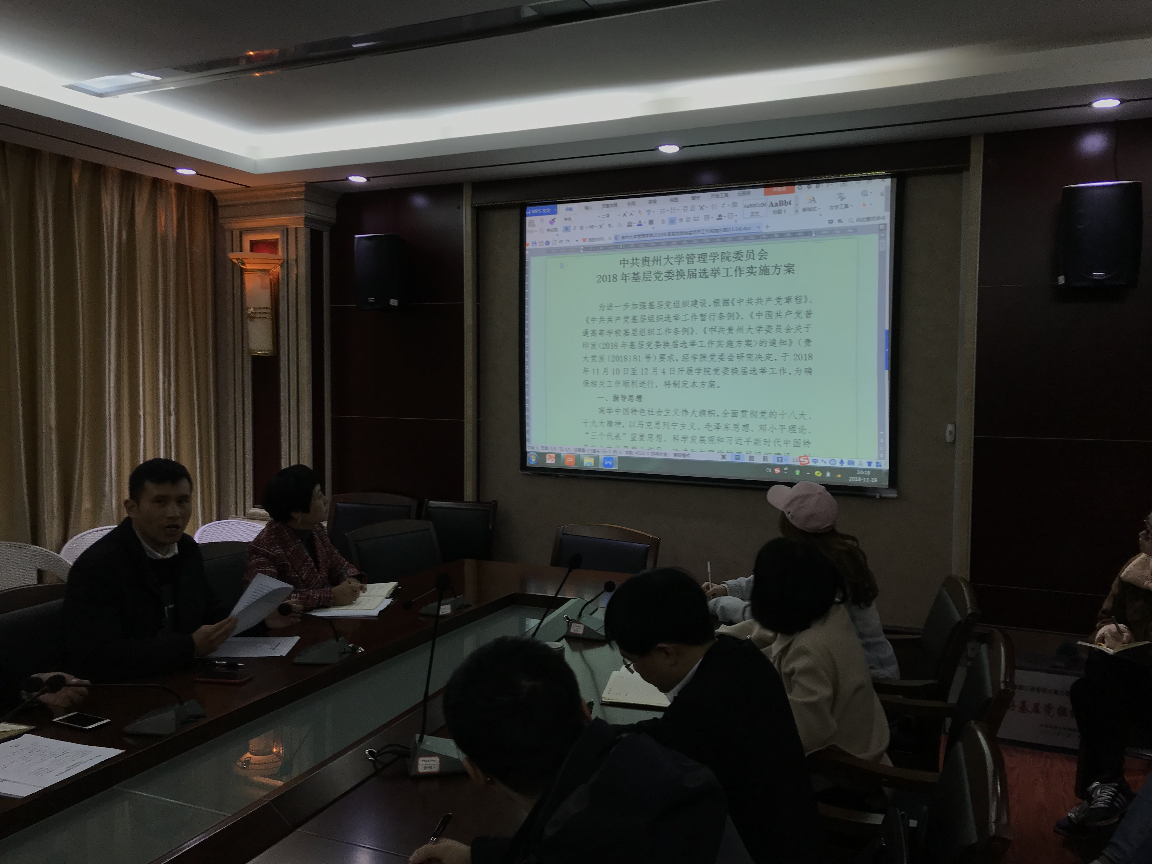 李烨院长首先介绍,根据《中共贵州大学委员会关于印发<2018年基层党委换届选举工作实施方案>的通知》(贵大党发〔201881号)要求,经学院党委会研究决定,于20181110日至126日开展学院党委换届选举工作。按照学校基层党委换届工作领导小组的要求,学院制定了《中共乐动官方网站委员会2018年基层党委换届选举工作实施方案》,请各党支部高度重视,积极配合,确保换届相关工作顺利进行。