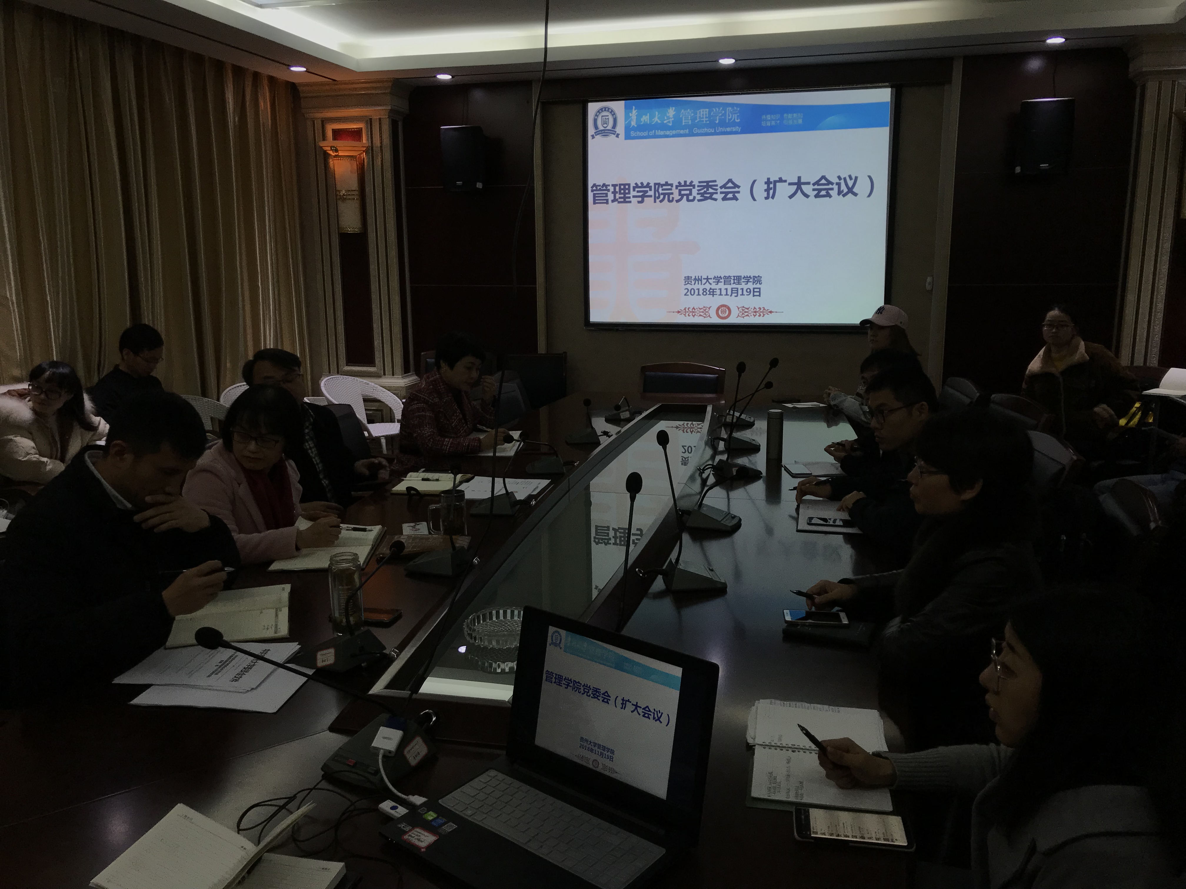 20181119日上午10:00,管理学院组织召开学院党委(扩大)会议,学院党委委员、各系教工党支部、各本科生、研究生支部的支部书记共22人参与会议,会议由李烨院长主持。