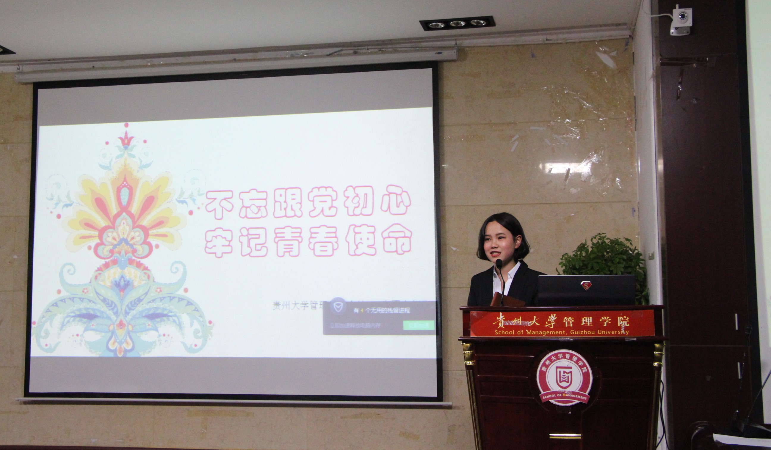 主持人先宣读了本次评比的注意事项和评分细则。之后由各参评班级代表上台,围绕本次主题对本班团组织生活进行讲解,并展示团组织活动的视频、海报等作品。参评的六个班级都开展了颇具特色的团组织生活:工商171班围绕“跟党走,不忘初心,牢记使命”的主题展开了青年学习、无手机课堂和参观孔学堂的活动;工业171班也紧紧围绕主题,进行了一二·九运动的宣讲、分享会、未来寄语以及室外拓展等活动;会计171班与工程161班首次进行了跨年级跨班级并联合社团的团组织活动,开展了主题辩论沙龙、户外团体活动以及“贵大式奇葩说”交流会等特色活动。各班用精彩的PPT讲解向大家展示了各自独特且丰富多彩的团组织生活,用不同的方式去了解、学习和宣传新时代的青年精神和使命,让同学们牢记使命,不忘初心。