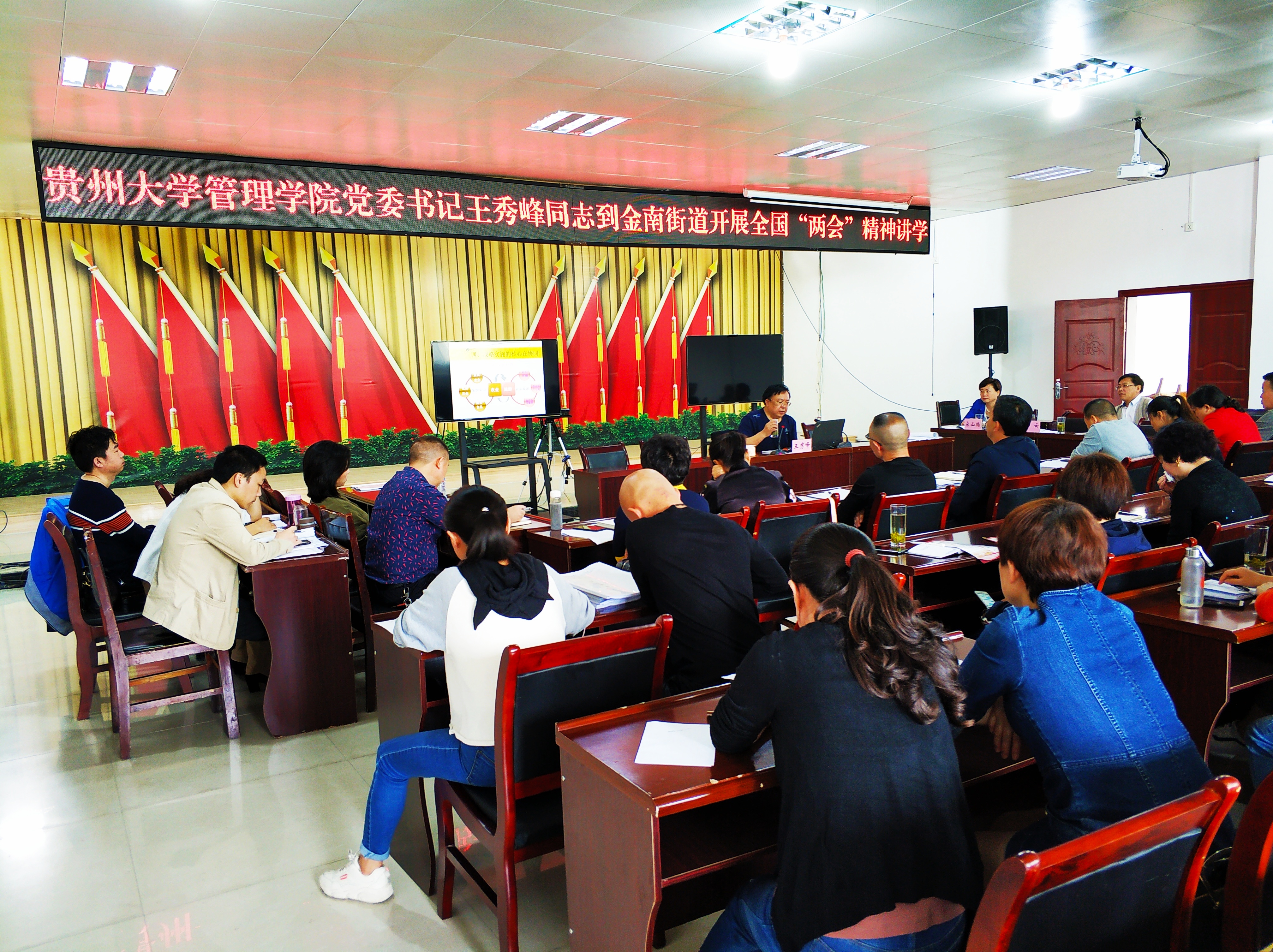 2019420乐动官方网站党委书记王秀峰教授应贵定县金南街道办事处基层党委邀请为贵定县乡镇干部“发挥优势、抓住机遇、实施乡村振兴战略、打好扶贫攻坚战”的主题讲座,管理学院副院长宋山梅教授、对外合作办公室主任王云副教授及营销系高波教授参加了此次活动。。