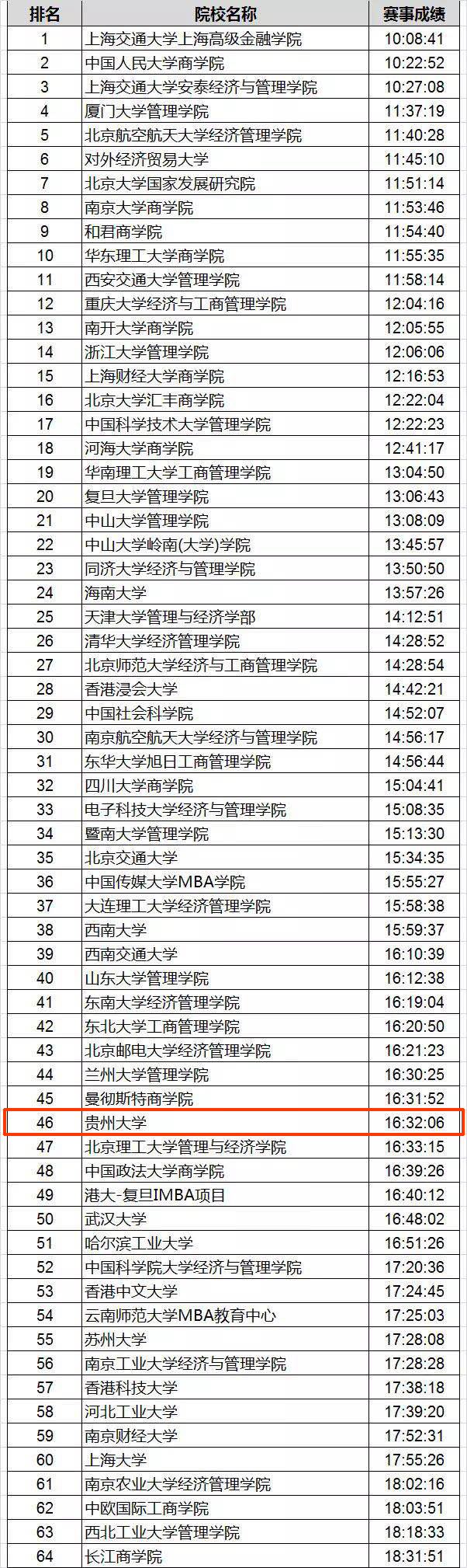 本次比赛贵州大学管理学院MBA中心主任邓琳老师与凌聪老师带队,并派出22名参赛队员,其中A队8名,分别是1704班秦振华、1707班刘昊天、1707班李雄、1706班欧航、1706班吴政翰、1706班杨邦、1705班徐洋、1707班张智勇;B队8名,分别是1706班周业阳、1807班田茂飞、1807班吴柯霖、1807班赵慧鹏、1703班胡丹、1705班陈玉婷、1806班陈思宇、1807班李梦姣;C队6名,分别是1706班任俊、1707班李彦欢、1701班车兆捷、1701班彭康、1502班闫力、1701班张妍,张妍作为学校记者随队参赛。
