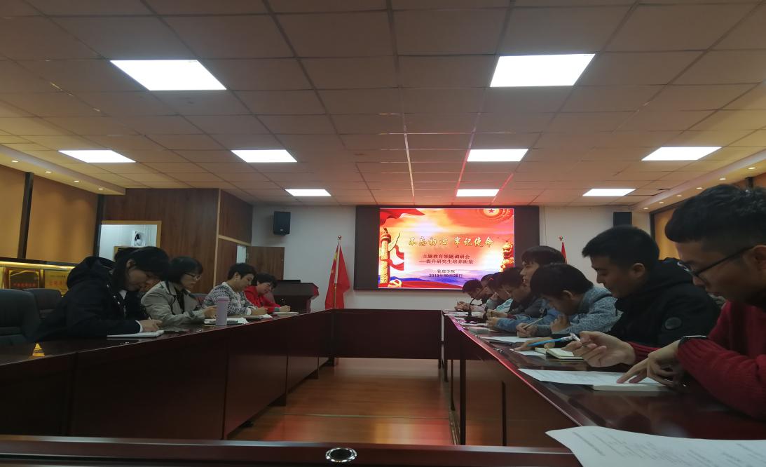 20191028日,乐动官方网站在致远楼三楼陈列室召开“不忘初心,牢记使命”主题教育领题研讨会之提升研究生培养质量,出席此次会议的领导有管理学院副院长王婷教授、管理学院副院长周莉莉教授、管理学院研究生科科长徐兰老师、管理学院工程硕士中心主任徐丹老师,除此之外还有管理学院201720182019级学术型硕士研究生学生代表。