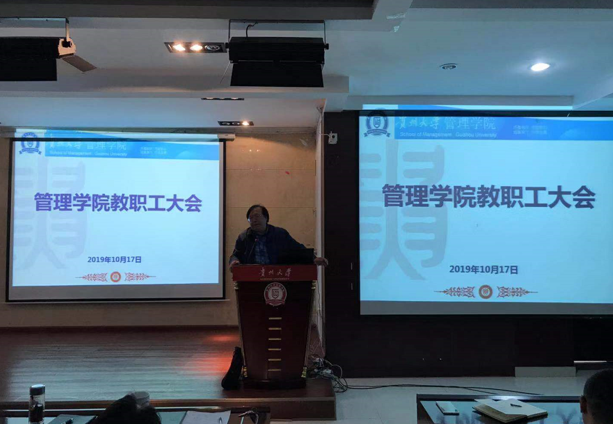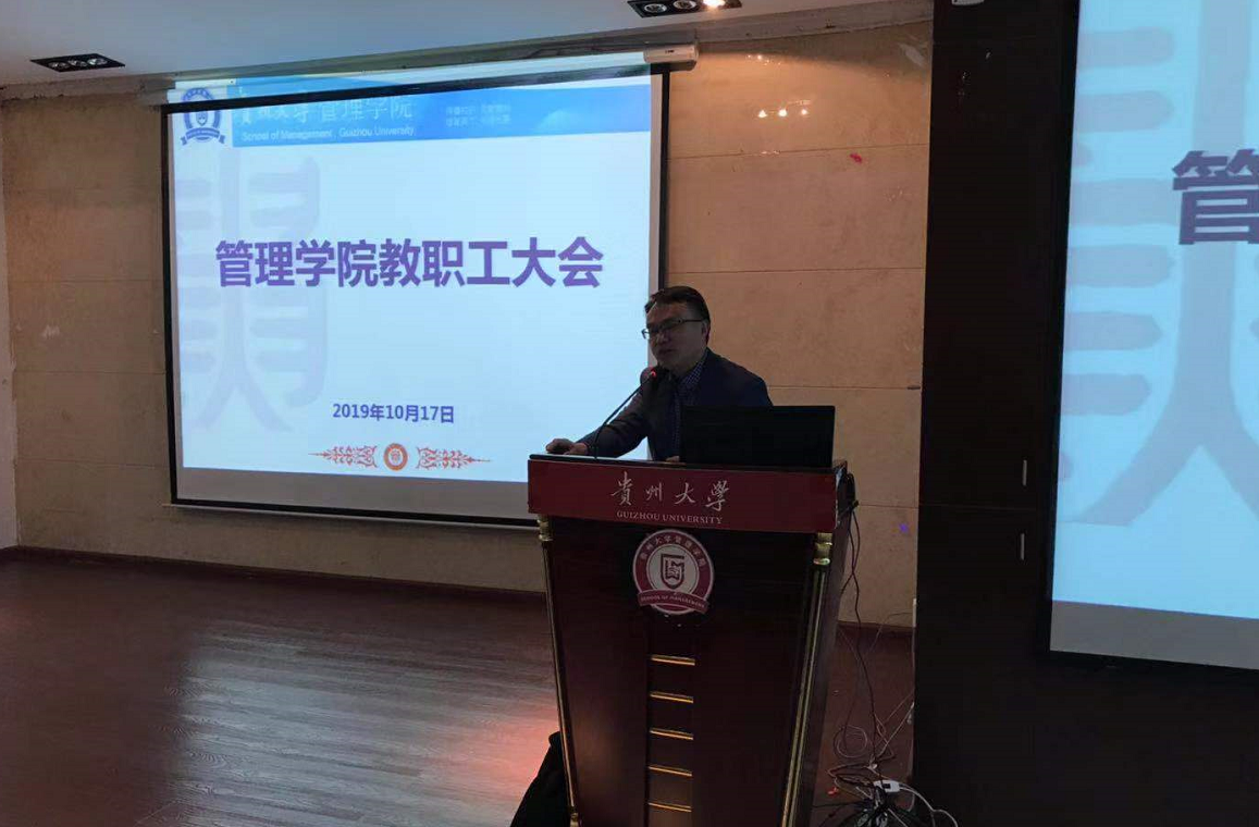 20191017日中午12:30,学院在致远楼三楼报告厅召开全院教职工大会。学院党政领导班子、全体教职工及学生党员代表参加会议。会议由学院党委副书记、院长李烨教授主持。