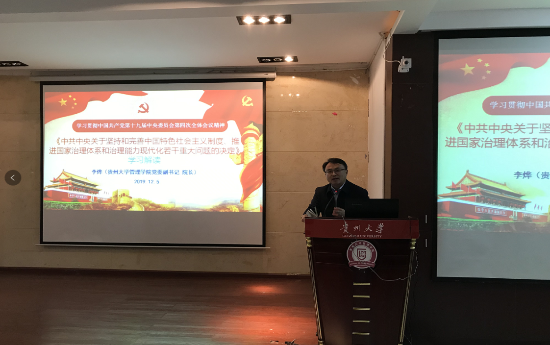会上,李烨院长按照《学习贯彻中国共产党第十九届中央委员会第四次全体会议精神》要求,对《决定》的起草背景、内容和意义进行详细解读。关于《决定》的具体内容,李烨院长首先就《决定》的整体框架为大家做了说明,即15部分3大板块;接着,李烨院长为大家详解了决定的1个重要判断、13个坚持和1个总体目标、13个坚持和完善的未来部署。