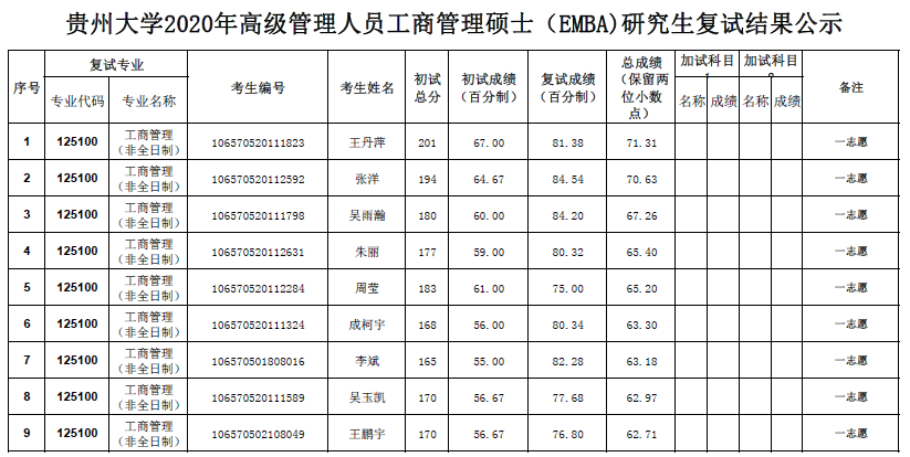 贵州大学2020年高级管理人员工商管理硕士(EMBA)研究生复试结果公示