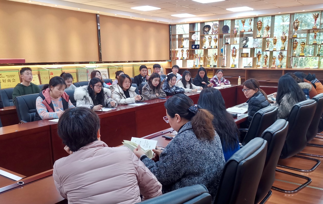 20213221300,管理学院组织2018各班级学生代表在管院三楼陈列室开展答疑会。旨在解答同学们培养方案、博学课程和考研相关方面的问题我院党委副书记洪影秋老师、教学科科长李静老师、研究生科科长徐兰老师、学生科科长芮丽华老师及四位学生科辅导员参加了本次答疑会。