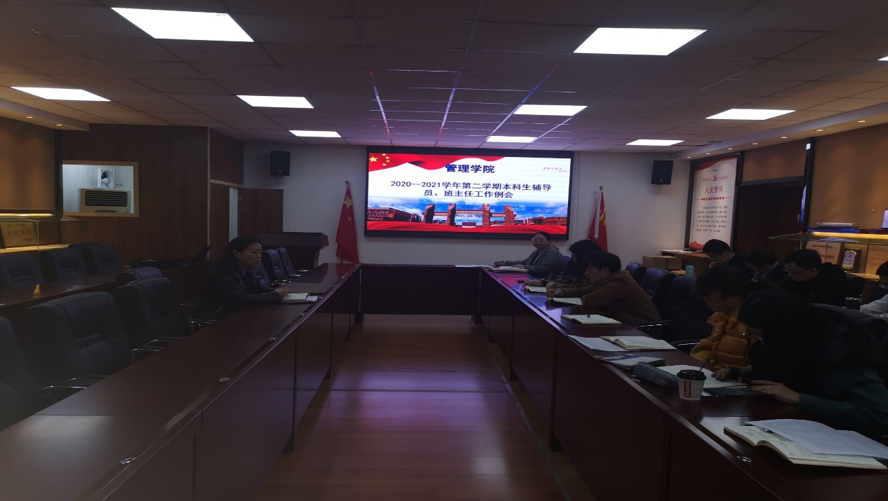 2021415日中午1400,管理学院于致远楼三楼陈列室召开管理学院2020-2021学年第二学期本科生辅导员、班主任工作例会。管理学院全体辅导员、班主任出席了本次会议。会议由院党委副书记洪影秋老师主持。