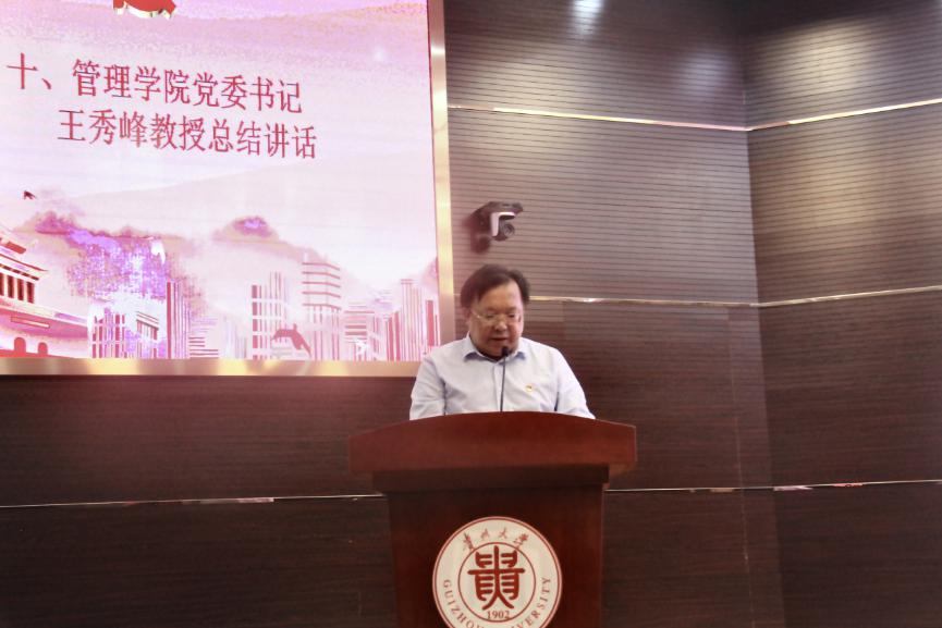 管理学院党委书记王秀峰同志作总结讲话,他强调,全体同志要坚定理想信念,践行初心使命。他号召,各基层党组织和全体党员以此次会议为契机,勤于学习、敢于拼搏、勇于创新、乐于奉献,进一步提升基层组织的凝聚力、组织力、战斗力,进一步发挥党员干部的表率作用、模范作用、带动作用。他希望,受到表彰的集体和先进个人珍惜荣誉、再接再厉,同时各级党组织、党员同志应向先进典型学习、看齐,在今后的学习和生活中共同推进管理学院各项事业取得新的发展,把我院开放、包容、务实、创新的发展理念发扬光大。