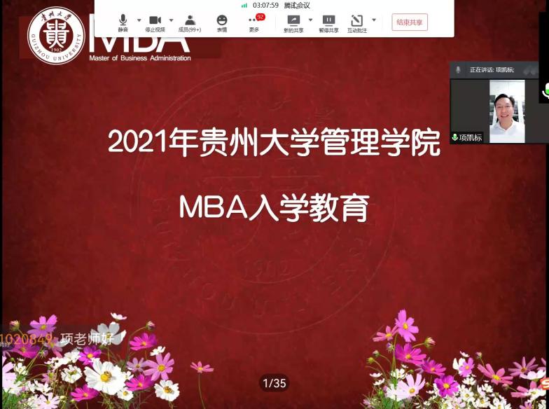 项凯标教授介绍了贵州大学基本情况,以及学校对MBA学生在学业方面的具体要求。他指出,要强化考勤管理,加强纪律教育,细化学业考核,规范过程管控,提升论文质量。此外,还要求同学们多交流,实现平台共建、资源共享,共同发展,作为一名新贵大人,还要全力配合做好2022120周年校庆和MBA20周年庆祝活动。