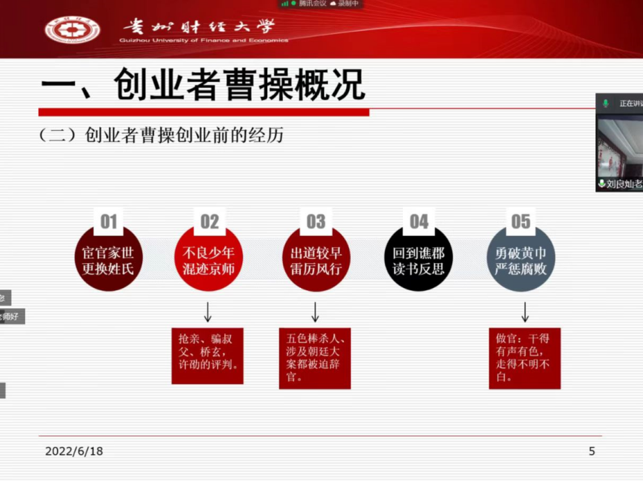 2022年6月18日晚上19:00-21:00,乐动官方网站MBA教育中心邀请贵州财经大学工商管理学院副院长刘良灿教授给MBA研究生做了“曹操的创业管理启示”为主题的管理前沿知识讲座,讲座由乐动官方网站MBA教育中心副主任何跃勇老师主持。由于新冠疫情影响,讲座采用腾讯会议的方式进行,MBA2020级、2021级四百多名同学和中心老师聆听了此次讲座。