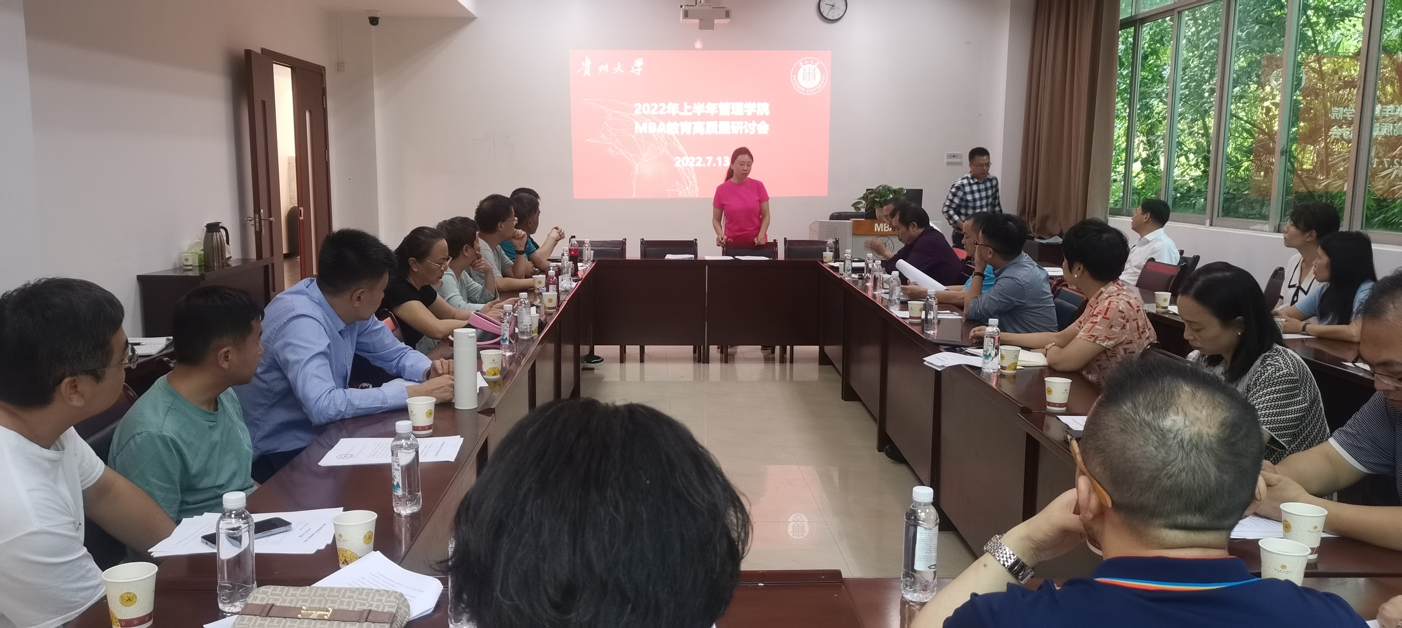 2022713上午,乐动官方网站MBA教育中心在慎思楼201教室举行2022上半年管理学院MBA教育质量研讨会”。贵州大学人民武装院副院长、管理学院副院长王婷教授,贵州大学党委正处级组织员周莉莉教授MBA中心主任项凯标教MBA中心任课老师、论文指导老师以及中心工作人员共40余人参加了此次研讨会。会议MBA中心副主任何跃勇老师主持。