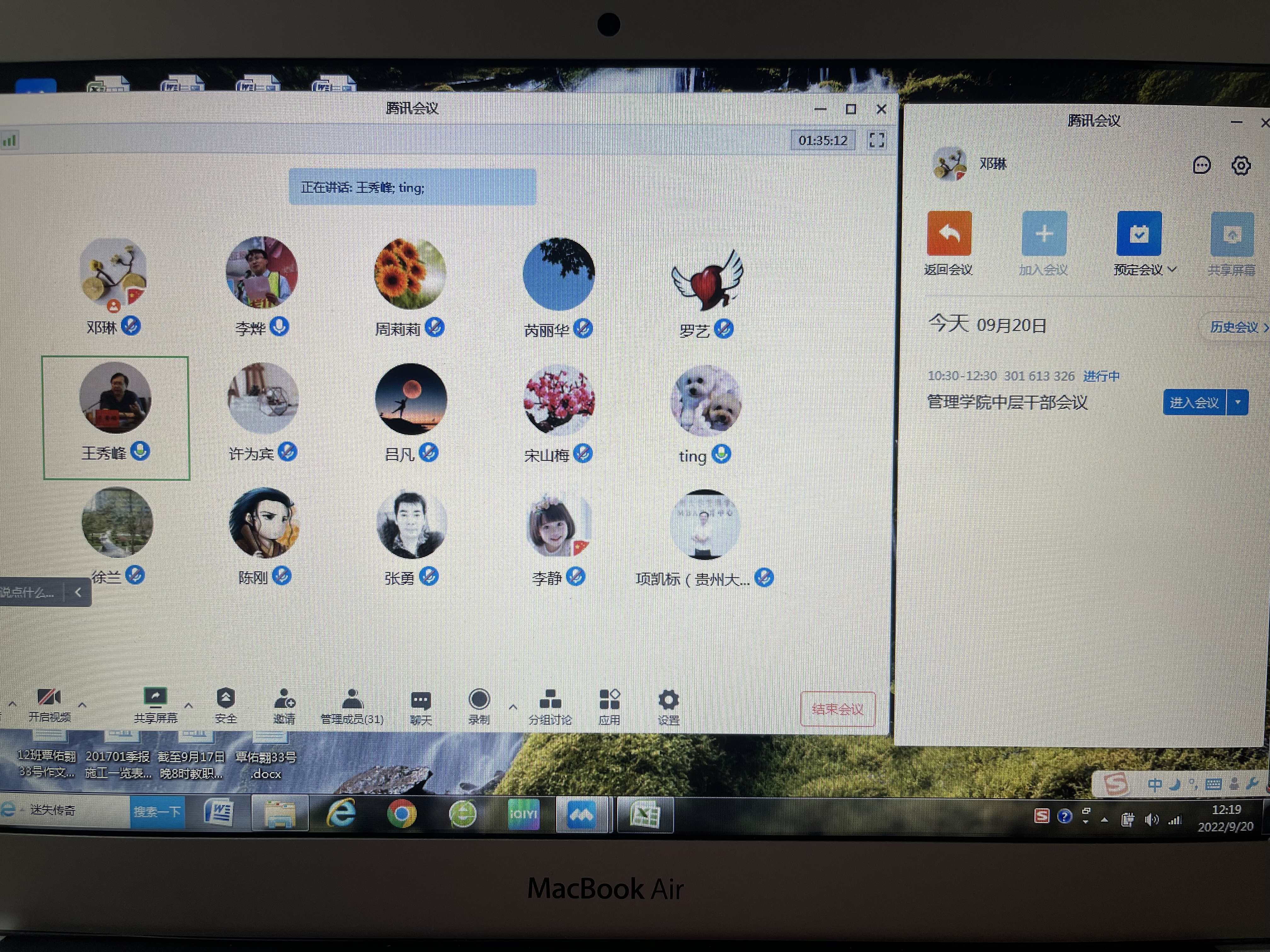 贵阳市疫情还在持续,在这非常时期,为坚决遏制疫情扩散,严格落实属地疫情防控要求,2022年9月20日上午10:30,管理学院通过腾讯会议线上平台召开学院中层干部会议,学院党政领导班子及各科室(中心)负责人、教研室主任、党支部书记等中层干部参加会议。会议由学院院长李烨教授主持。