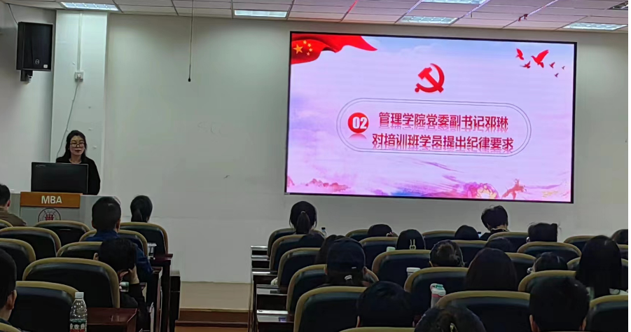 管理学院党委副书记邓琳老师就第三十八期入党积极分子培训班暨第十七期党员发展对象培训班培训安排及纪律及评优等方面提出要求,她强调:希望各位学员认真遵守培训安排,政治站位要高,积极主动学习吸收中国共产党的理论知识,用理论武装自己,要在实践中不断坚定自己的入党动机,希望大家能够从现在开始高标准严要求,并从严格遵守培训班纪律开始不断磨砺自己吃苦耐劳的能力,并希望在座的各位学员都能够顺利结业。
