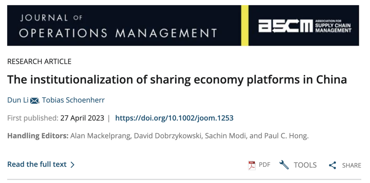 近日,我院李盾博士与美国密歇根州立大学商学院Tobias Schoenherr教授合作的研究成果《The institutionalization of sharing economy platforms in China》在运营管理/供应链管理国际顶级期刊《Journal of Operations Management》上在线发表。李盾博士为第一作者和通讯作者,乐动官方网站为第一署名单位。