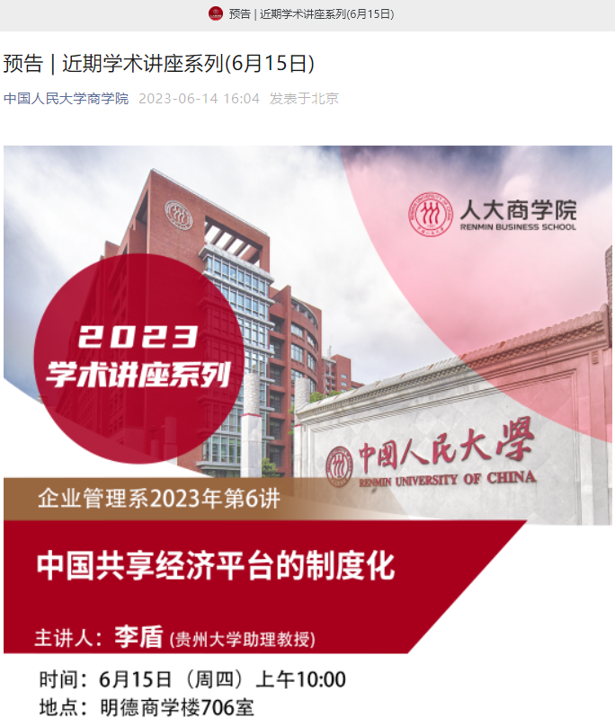 615日,管理学院李盾博士应邀前往中国人民大学商学院,开展学术交流。