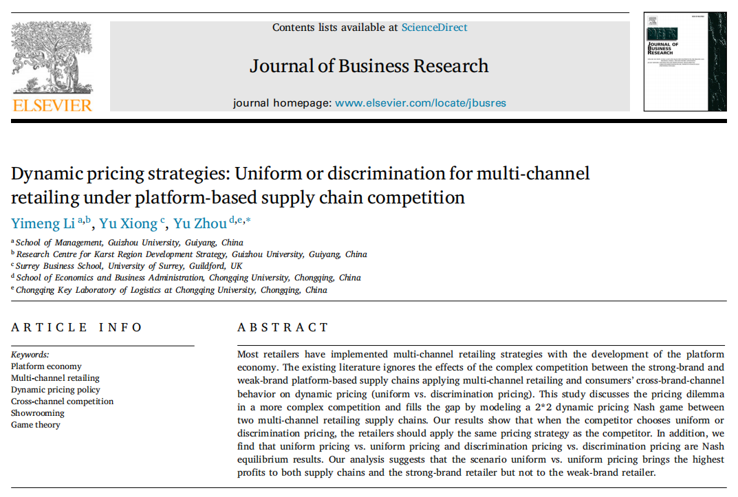近日,我院教师李义猛的最新研究成果《Dynamic pricing strategies: Uniform or discrimination for multi-channel retailing under platform-based supply chain competition》在国际知名期刊《Journal of Business Research》上在线发表。李义猛博士为论文第一作者,乐动官方网站为第一署名单位。
