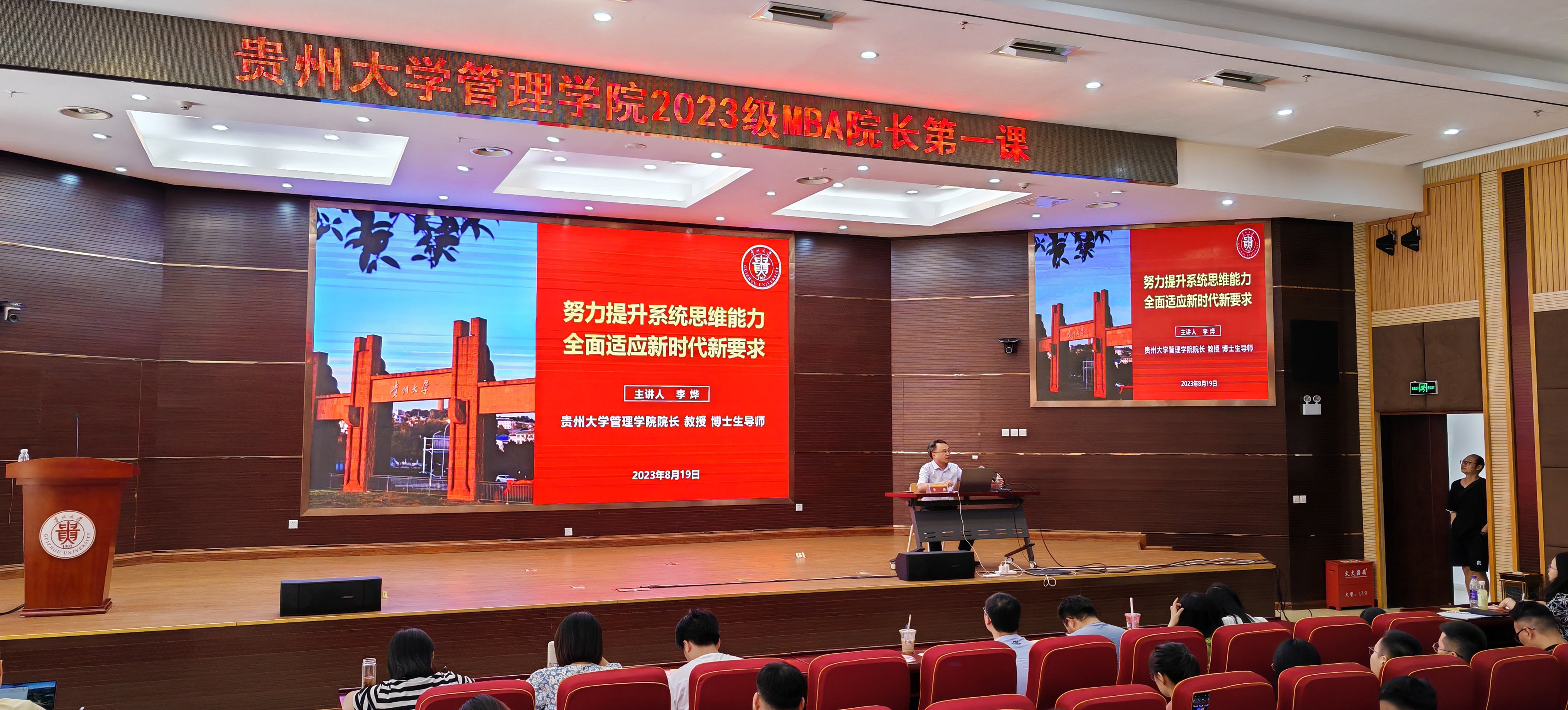 2023年8月19日上午,乐动官方网站MBA教育中心在西校区贤正楼107报告厅隆重举行了“乐动官方网站2023级工商管理硕士(MBA暨EMBA)开学典礼”。乐动官方网站院长李烨教授,贵州大学党委正处级组织员、管理学院党委副书记(主持党委工作)周莉莉教授,管理学院副院长李本光教授,副院长宋山梅教授,副书记邓琳老师,MBA中心主任项凯标教授,MBA导师代表刘遗志教授,管理学院各科室负责人、MBA教育中心全体老师、班主任,2023级MBA、EMBA新生共460余名参加了开学典礼。典礼由副院长李本光教授主持。