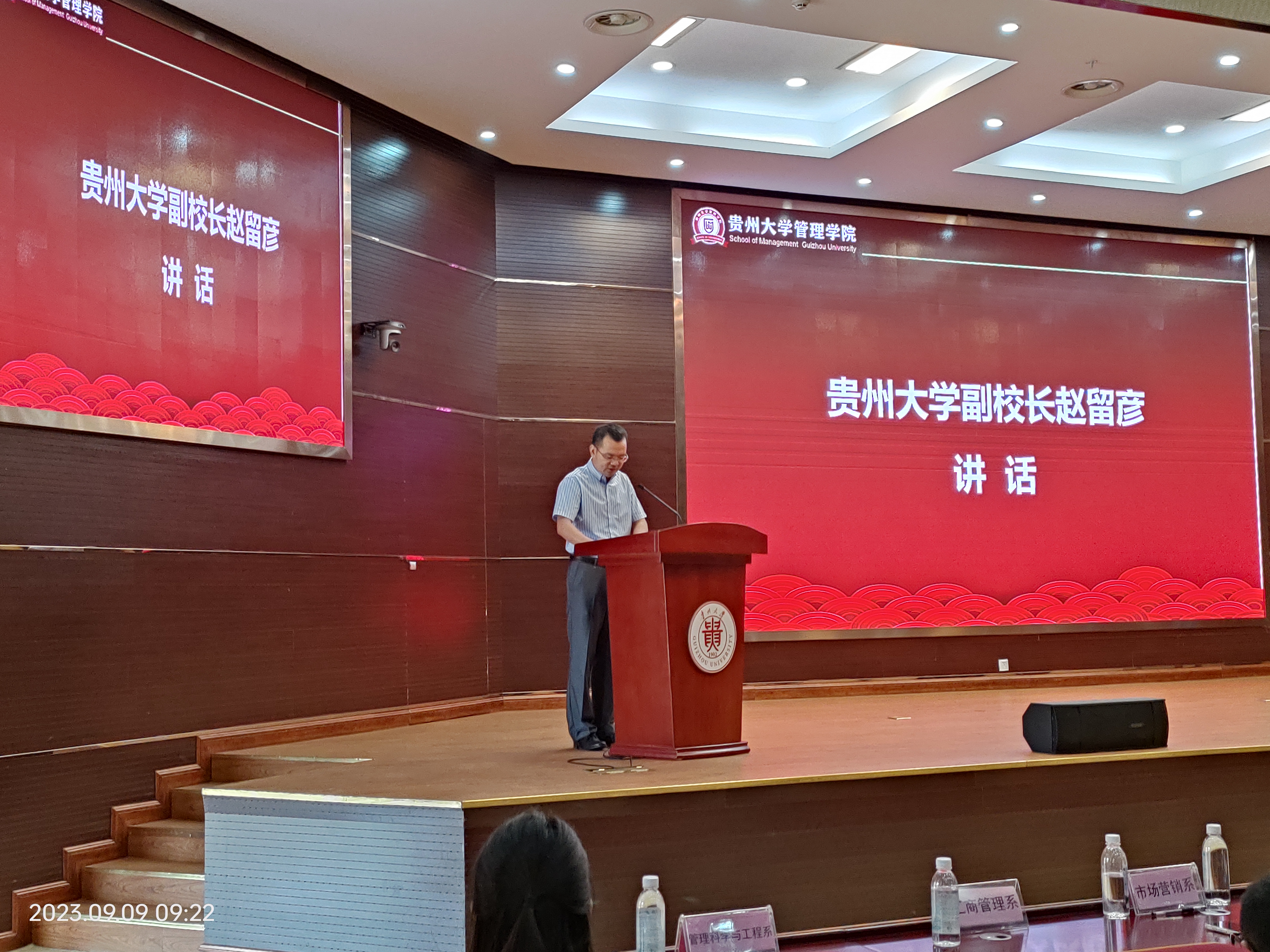 启动仪式第一项,由贵州大学副校长赵留彦教授讲话。他在讲话中指出,“‘致远大讲坛’的启动标志着管理学院教育事业又迈出了坚实的一步,作为教育工作者,我们应该时刻保持对教育事业的热爱和责任感,秉持着育人为本的理念,不断追求教书育人的卓越”。