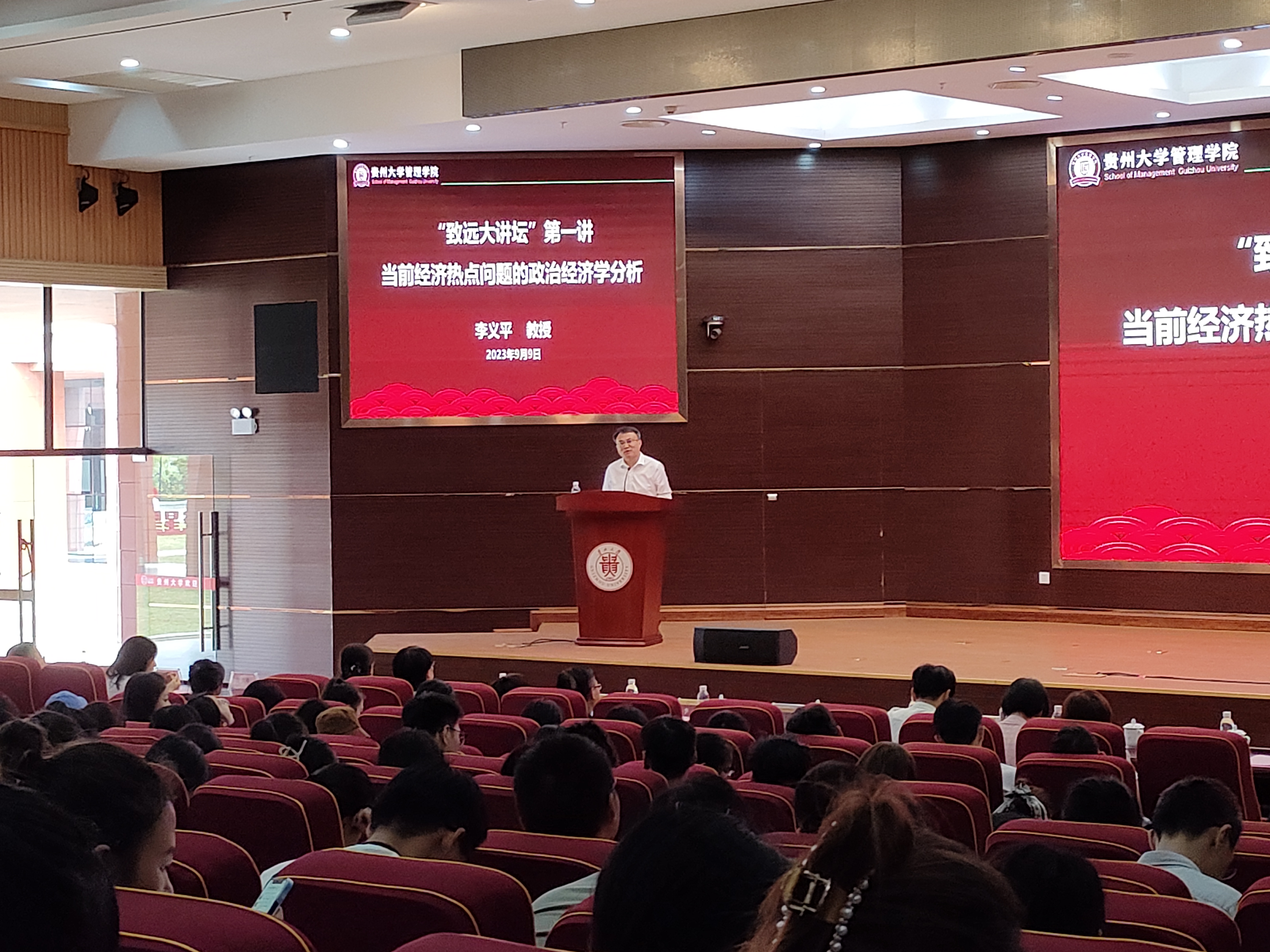 随后,由贵州大学党委委员、管理学院院长李烨主持“致远大讲坛”第一讲。本次讲座的主讲人李义平教授,是北京大学第一位经济学博士后,中国人民大学经济学教授、博士生导师(人大名师)。中国人民大学全国中国特色社会主义政治经济学研究中心学术委员会委员、中国人民大学习近平新时代中国特色社会主义思想研究院校内特约研究员、中央国家机关“学经典、作表率”《资本论》导读老师、中组部中国延安干部管理学院特聘教授。