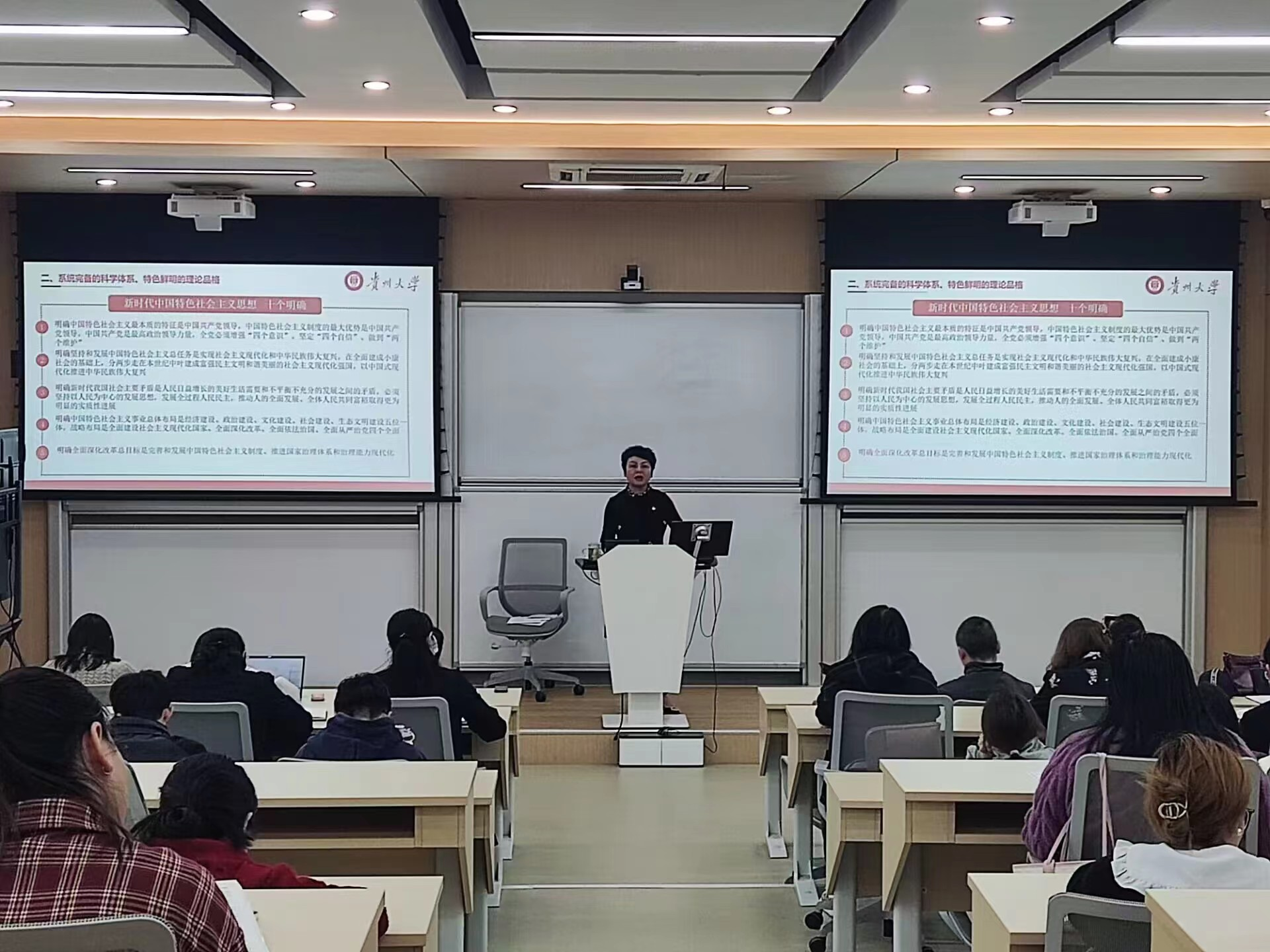 最后,周莉莉副书记还传达了贵州省第十三届委员会第三次全体会议和全省高等教育高质量发展大会的精神。贵州省第十三届委员会第三次全体会议强调了党的二十大计划,提出了新时代新征程中国共产党的中心任务是全面建设社会主义现代化国家。会议还强调加快建设具有贵州特色的现代化产业体系,并推动人口高质量发展。在全省高等教育高质量发展大会上,习近平总书记指明了高等教育发展的方向,在该方向的指引下,贵州大学从价值塑造和人才培养计划、优化学科建设、推进人才大会计划几个方面提出了未来发展规划。