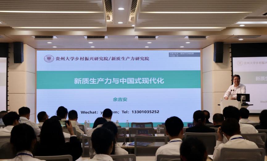 第二项议程是贵州大学乡村振兴研究院(新质生产力研究院)院长余吉安教授为大家带来了题为“新质生产力与中国式现代化”的主题演讲。余教授围绕四个重要议题进行了深入的观点阐述:新质生产力提出背景;新质生产力的定义和内涵;新质生产力与中国式现代化的关系;以及如何发展新质生产力。通过这次演讲,余教授为我们在更高层次上孕育和发展新质生产力提供了宝贵的理论思考和实践经验的借鉴。