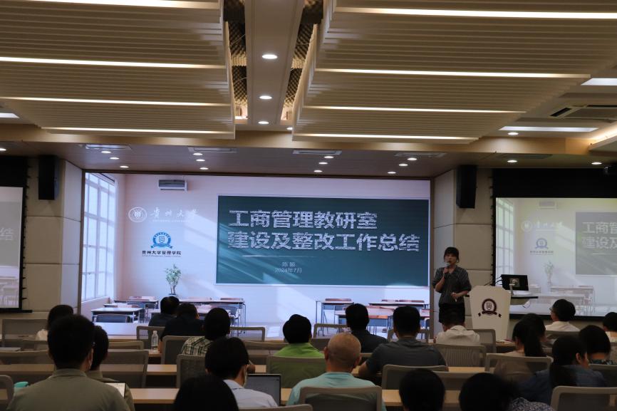 会议第五项,工商管理教研室主任陈颖副教授对工商管理教研室建设及整改工作进行汇报。她从教研室基本情况、教学理念、提升教学质量的措施和成效、人才培养总体情况等方面进行详细介绍,强调了跨界融合、创新驱动等教学理念的重要性,并分享了教研室在课程建设、产教融合等方面的显著成就,同时,她也指出了存在的不足并提出了整改措施。