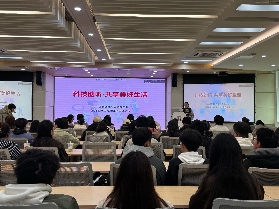 贵州省残疾人康复中心于3月4日中午1点在致远楼管理学院305报告厅开展了以“科技助听,共享美好生活”为主题的“爱耳日”健康教育进校园宣传活动,该活动旨在通过专业的知识传授和实践操作,增强公众对听力保健的意识,同时为听力受损的个体提供康复指导和支持。