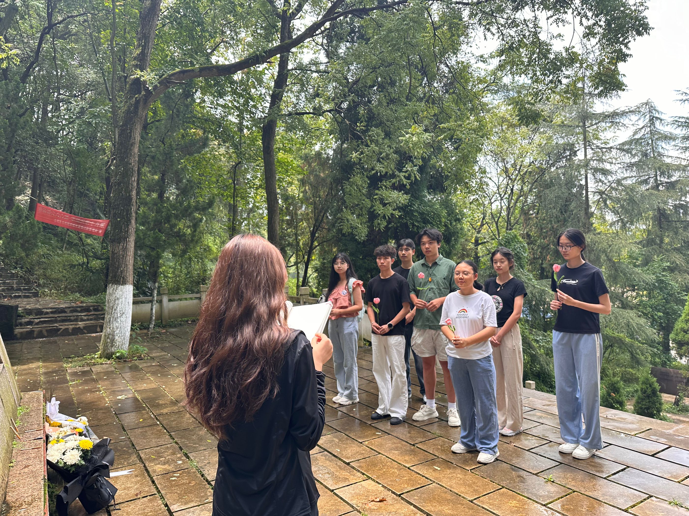 在烈士陵园中,团支书侯扬帆同学带领团员们仔细研读习近平总书记的重要讲话,感悟先辈们在硝烟弥漫的岁月中展现出的爱国情怀与民族气节,并带领大家进行扫墓活动。同学们轻轻擦拭墓碑上的尘埃,将亲手制作的“扭扭棒”花束整齐地摆放在墓前,深深鞠躬。同学们还采用自媒体的手段,创新拍摄转场视频,寓教于乐,再现了抗战历史上的经典瞬间。