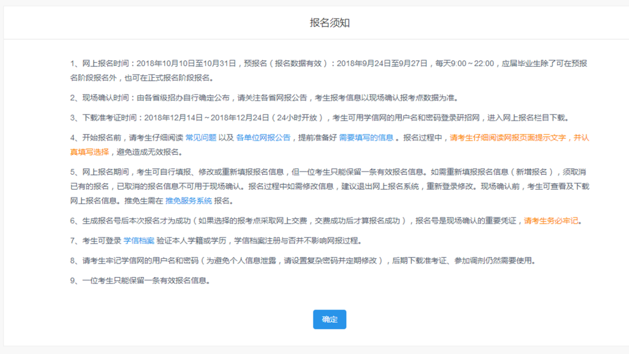 5.现场确认时间在20181110日之前,具体安排请查看各省级招办发布的网报公告http://yz.chsi.com.cn/sswbgg/