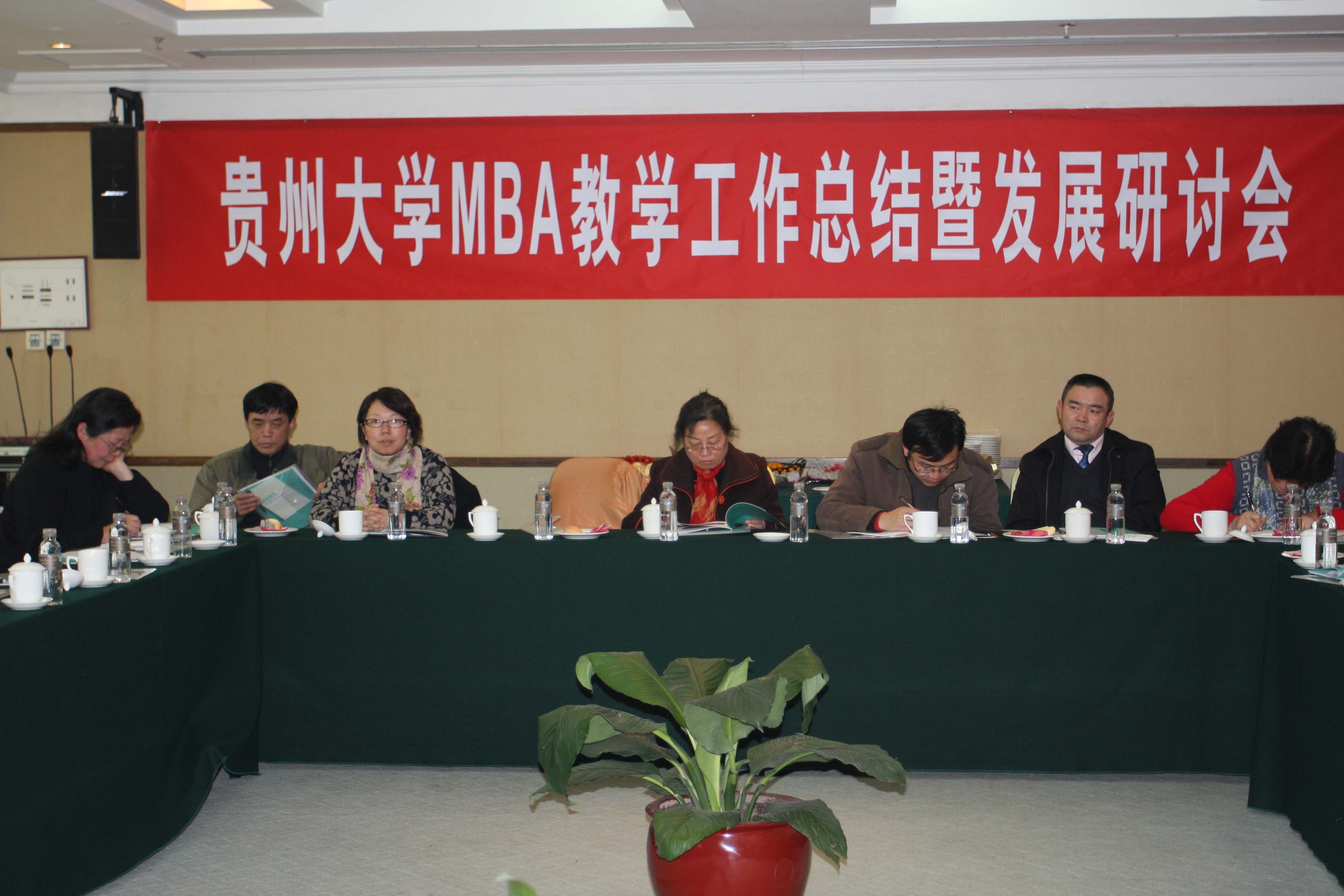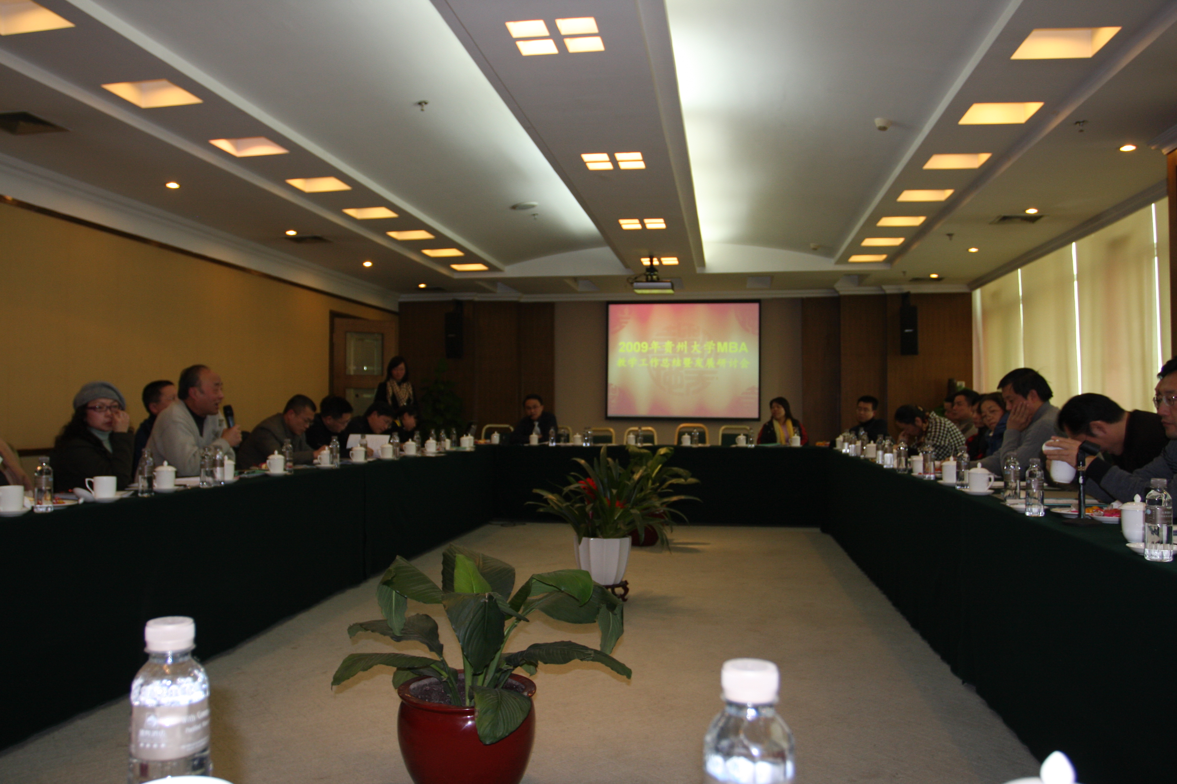 州大学副校长王红蕾教授首先向百忙之中来参会的各位领导、老师表示热烈的欢迎和诚挚的谢意,并宣布了本次会议的议程和研讨会的三大主题,即MBA的生源筹划问题、MBA的培养方案制定问题、MBA的师资建设问题。然后MBA教育中心主任李烨博士作了2009年贵州大学MBA工作总结汇报,并指出了当前所面临的问题,同时提出了对未来发展的几点思考。听了工作汇报之后,论文导师代表贵阳市常务副市长申振东教授作了热情洋溢的发言,指出贵阳市未来的规划发展给MBA发展带来新的机遇与挑战,要求贵大MBA抓住机遇,迎接挑战,并祝贵大MBA更强大,更健康,更可持续。接着管理学院副书记&副院长任洲麒博士传达了在2009年12月初武汉召开的《第四届全国MBA教育指导委员会第五次全体会议暨MBA培养学校管理学院院长联席会》会议精神。