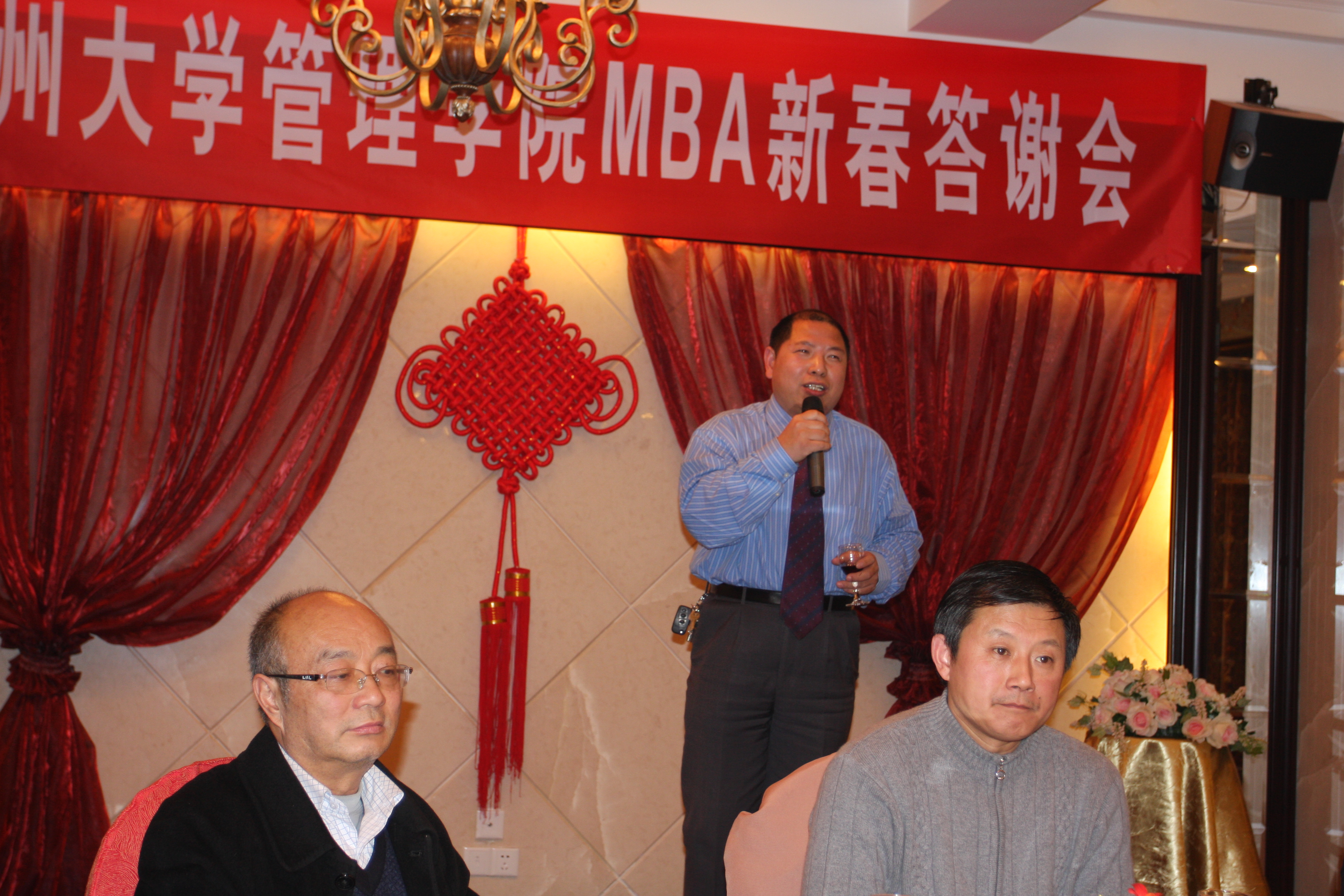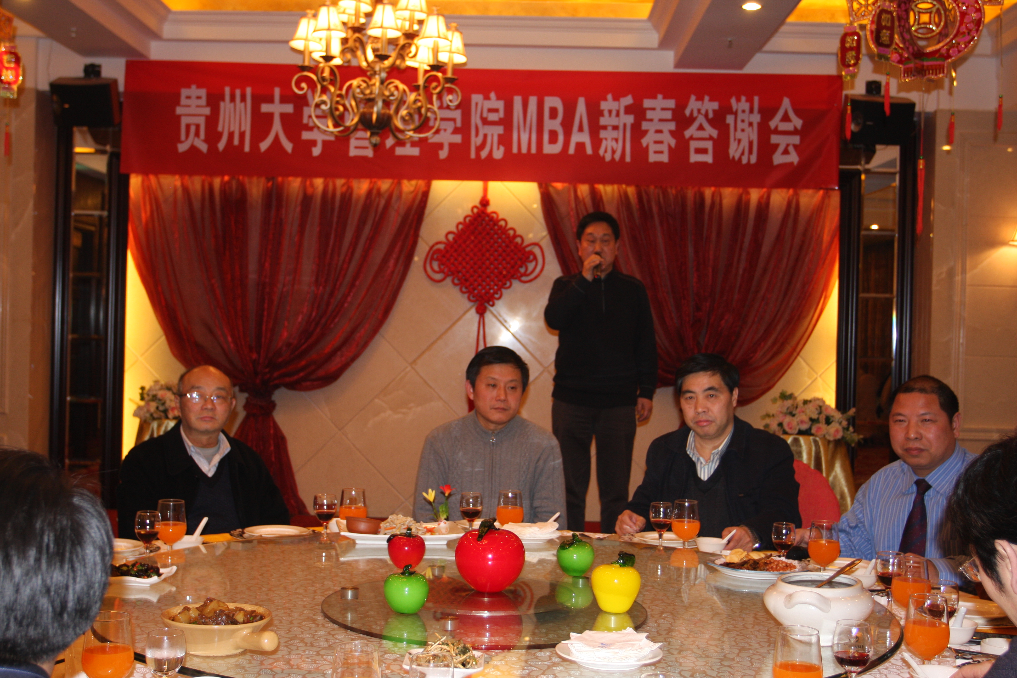 校长赵德刚教授向参加答谢晚宴的各位MBA任课教师、论文指导老师和MBA联合会成员代表致以了新年的美好祝福。赵校长在致辞中说:过去一年来,贵州大学MBA教育取得了可喜的成绩,这与在座的各位专家的加盟、支持和理解是分不开的,2009年贵州大学成为第二批EMBA试办院校,这为贵大MBA教育的快速发展提供了千载难逢的机遇,希望大家今后一如既往地支持我校MBA教育,为贵州培养更多的高素质管理人才。