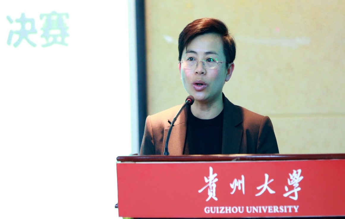 贵州大学党委令狐彩桃副书记致辞。她希望各参赛队伍能够以本次比赛为契机,持续对接麻江县当地,针对自己感兴趣的农产品探索营销新模式,创造性地发掘农产品的价值,将自己的项目坚持下去,创造出消费者买到好东西、扶贫产品卖出好价钱、贫困群众增收闯出好路子的多赢局面,酿造出增加扶贫产品品牌价值、激发扶贫产品市场活力的良性社会效应,展现出贵大学子敢为人先、忧国忧民的家国情怀和在响应“乡村振兴”战略中的担当作为。